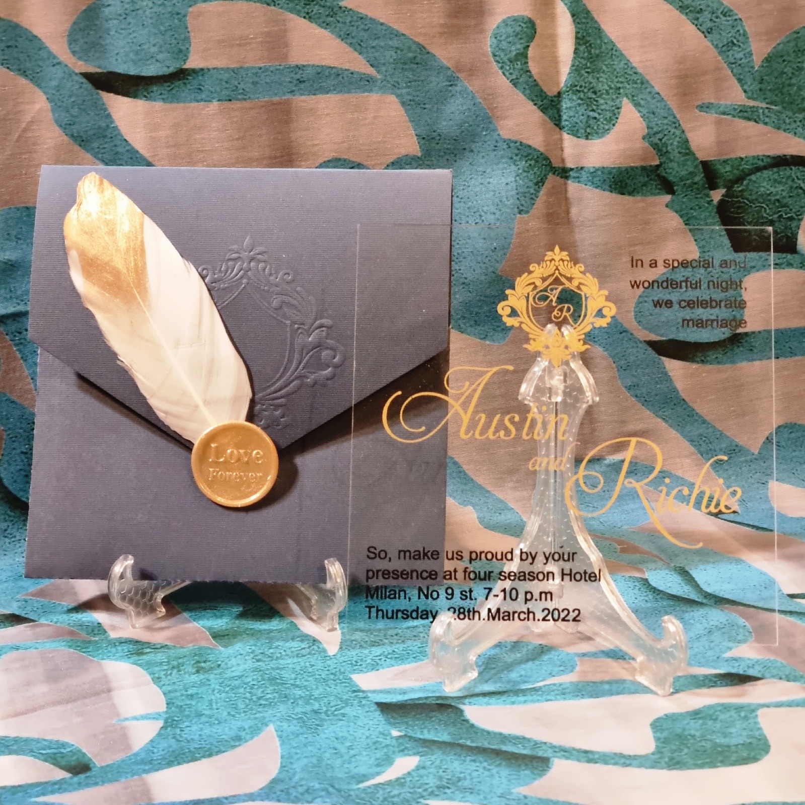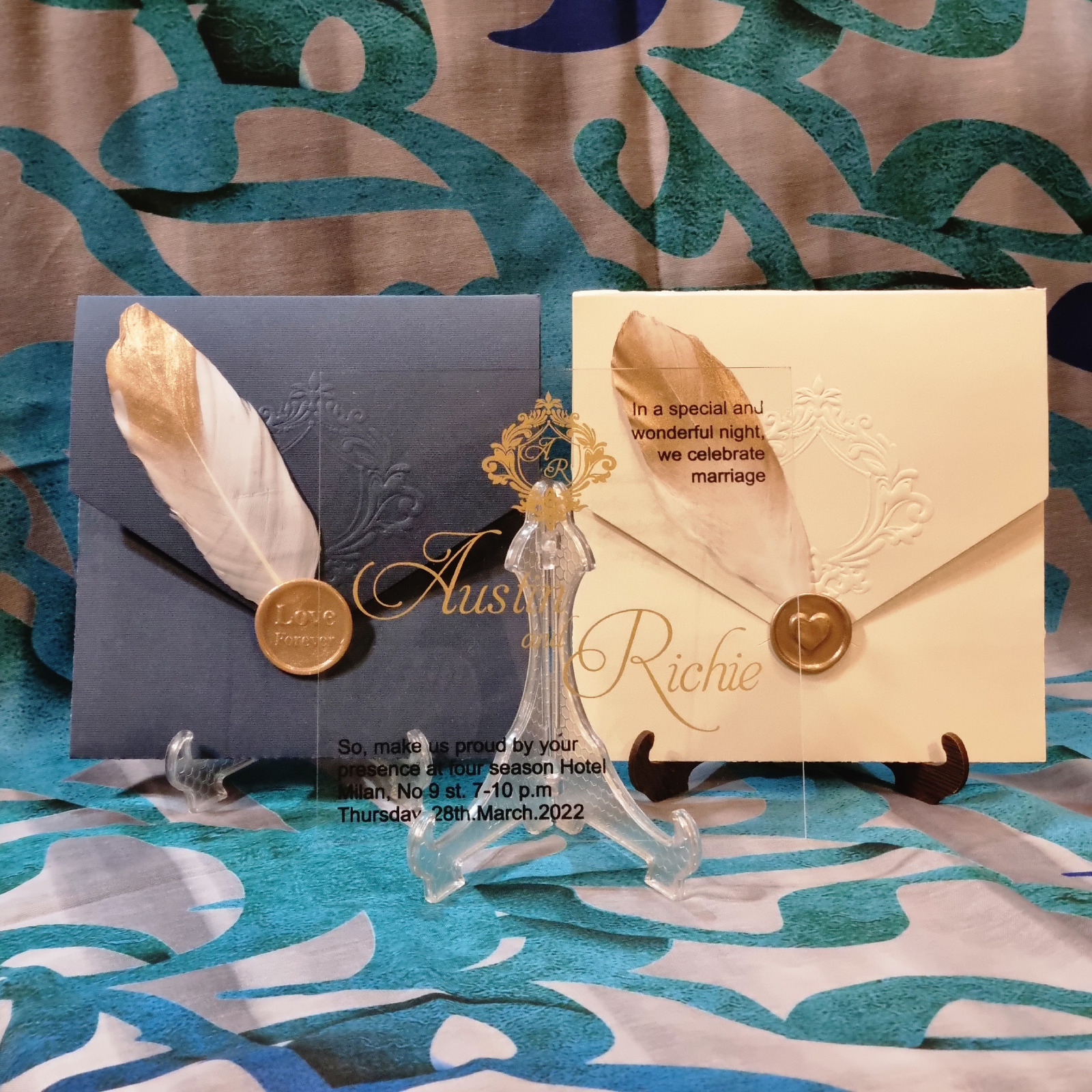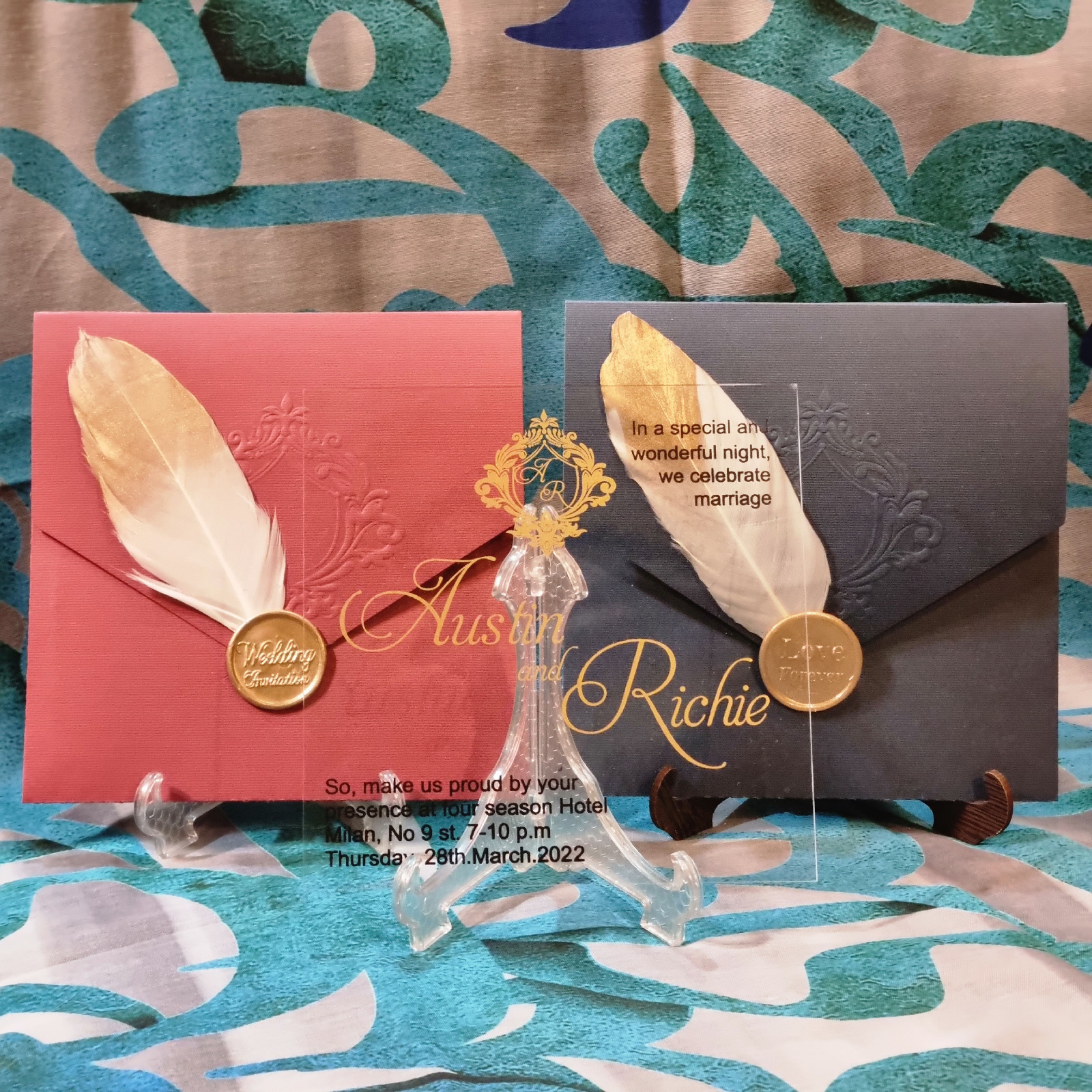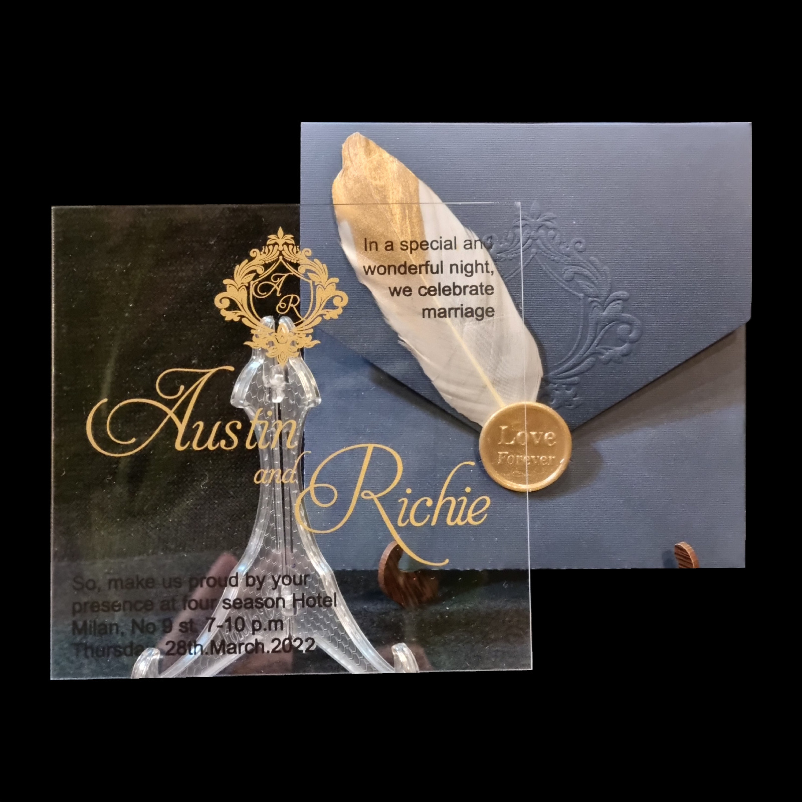 این کارت عروسی از جنس پلکسی خارجی شفاف کیفیت بالا می باشد. چاپ 2 رنگ است و یک کارت دعوت لاکچری است. سایز کارت 15.5×15.5 می باشد. پاکت مقوای سرمه ای خارجی همراه با مهر و موم و پر است. طرح مهر و موم و رنگ پر قابل تعویض است. برای اطلاع از قیمت و سفارش در واتساپ یا تلگرام پیام بگذارید.