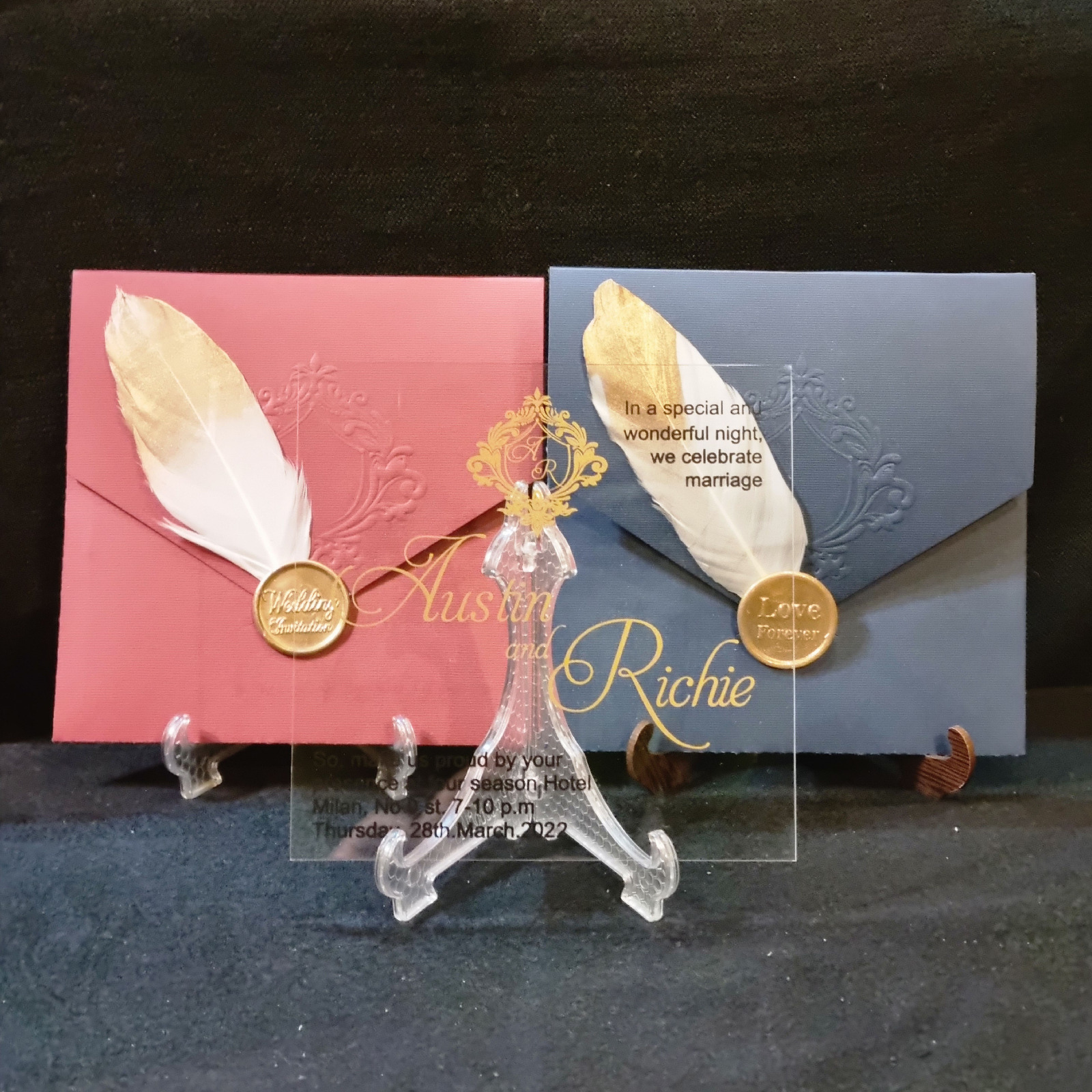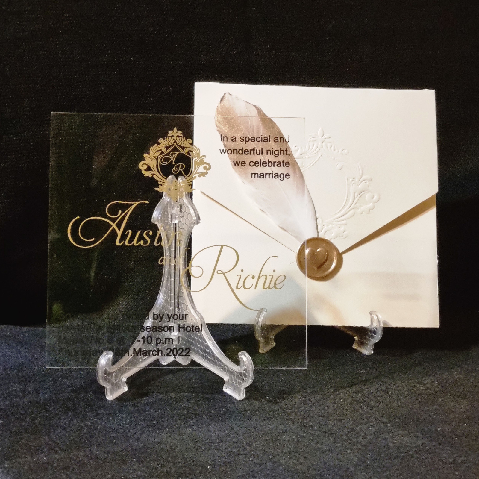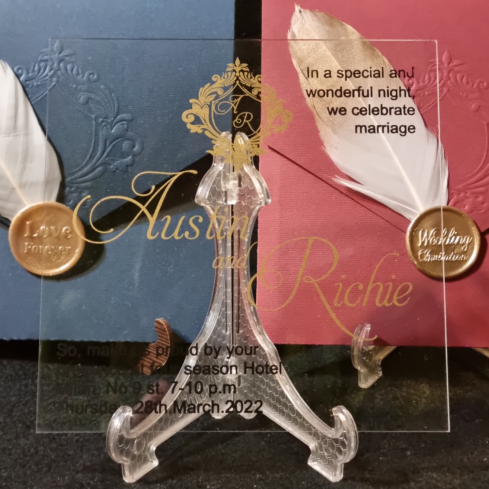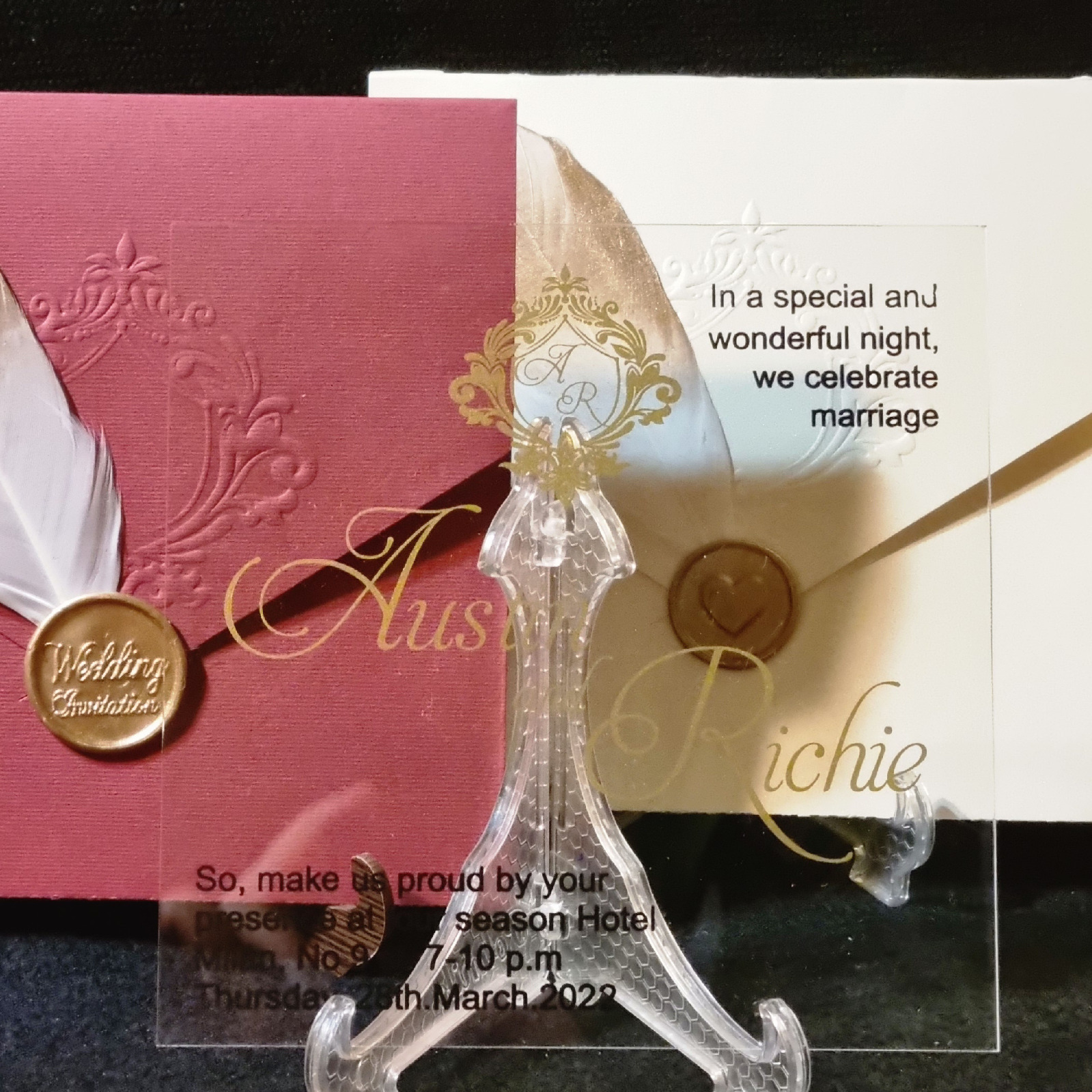 این کارت عروسی از جنس پلکسی خارجی شفاف کیفیت بالا می باشد. چاپ 2 رنگ است و یک کارت دعوت لاکچری است. سایز کارت 15.5×15.5 می باشد. پاکت مقوای سرمه ای خارجی همراه با مهر و موم و پر است. طرح مهر و موم و رنگ پر قابل تعویض است. برای اطلاع از قیمت و سفارش در واتساپ یا تلگرام پیام بگذارید.