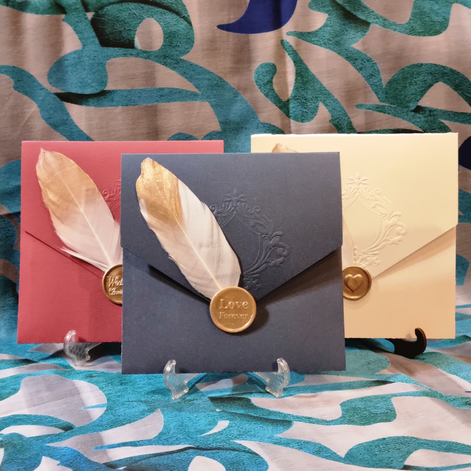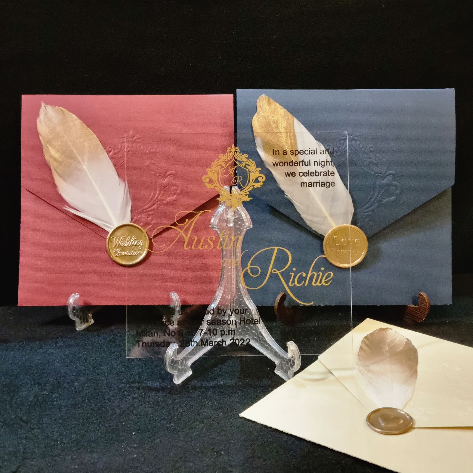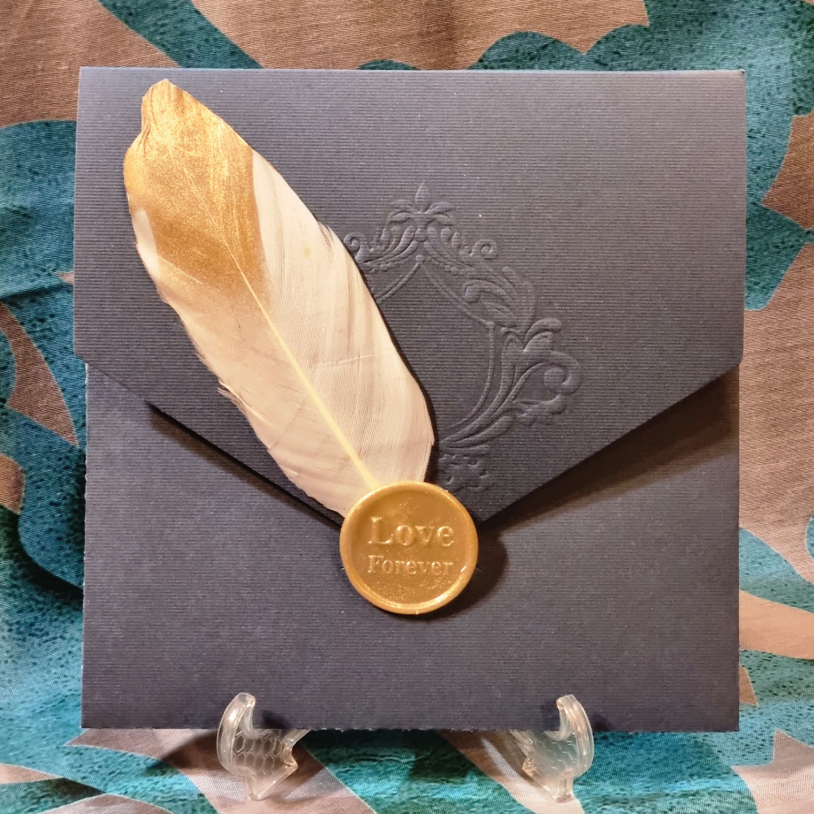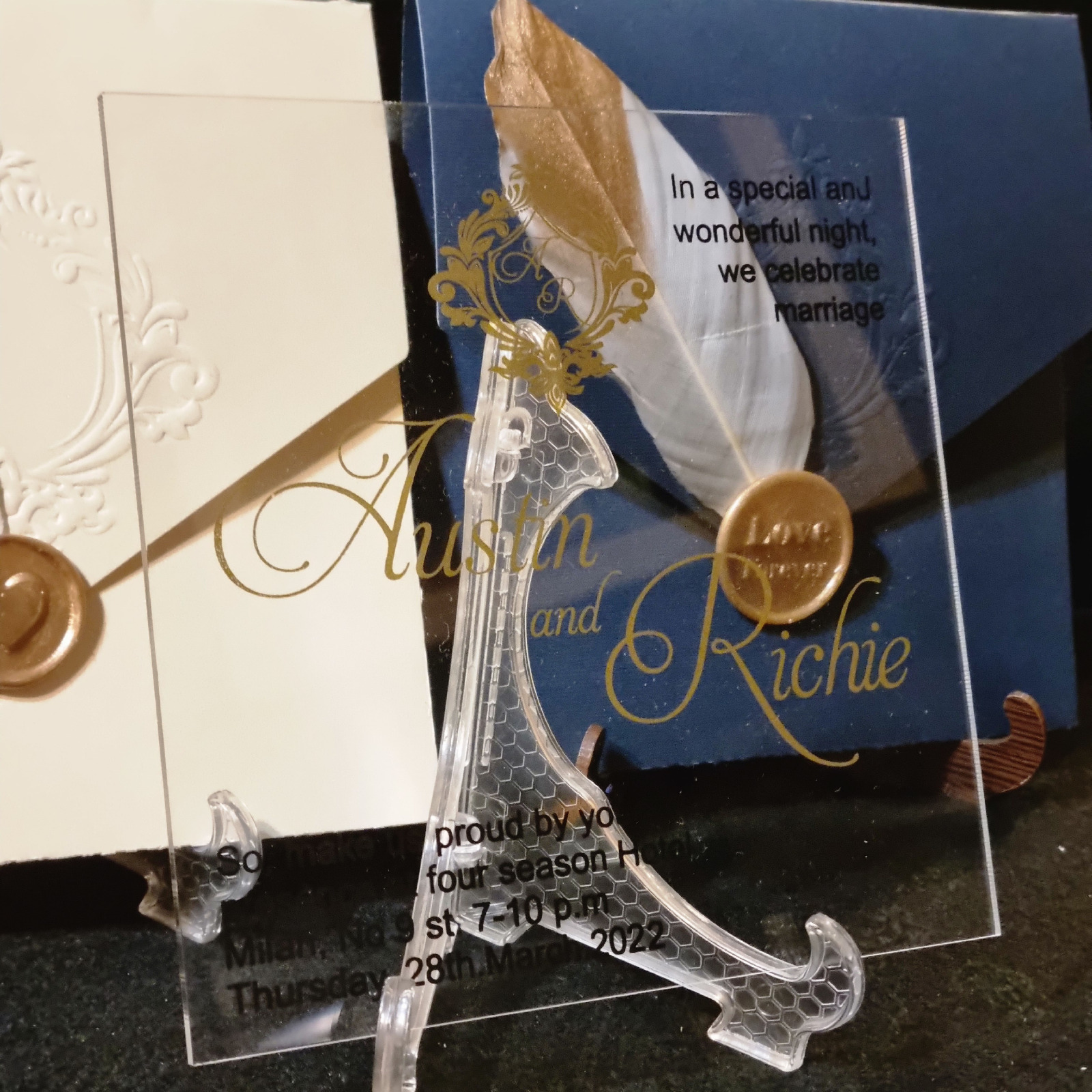 این کارت عروسی از جنس پلکسی خارجی شفاف کیفیت بالا می باشد. چاپ 2 رنگ است و یک کارت دعوت لاکچری است. سایز کارت 15.5×15.5 می باشد. پاکت مقوای سرمه ای خارجی همراه با مهر و موم و پر است. طرح مهر و موم و رنگ پر قابل تعویض است. برای اطلاع از قیمت و سفارش در واتساپ یا تلگرام پیام بگذارید.