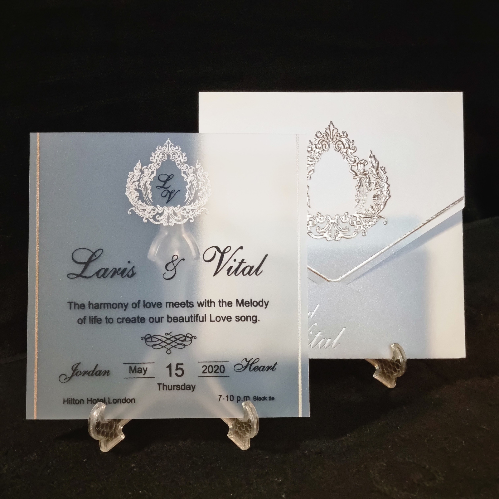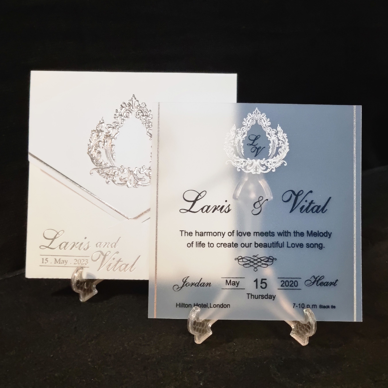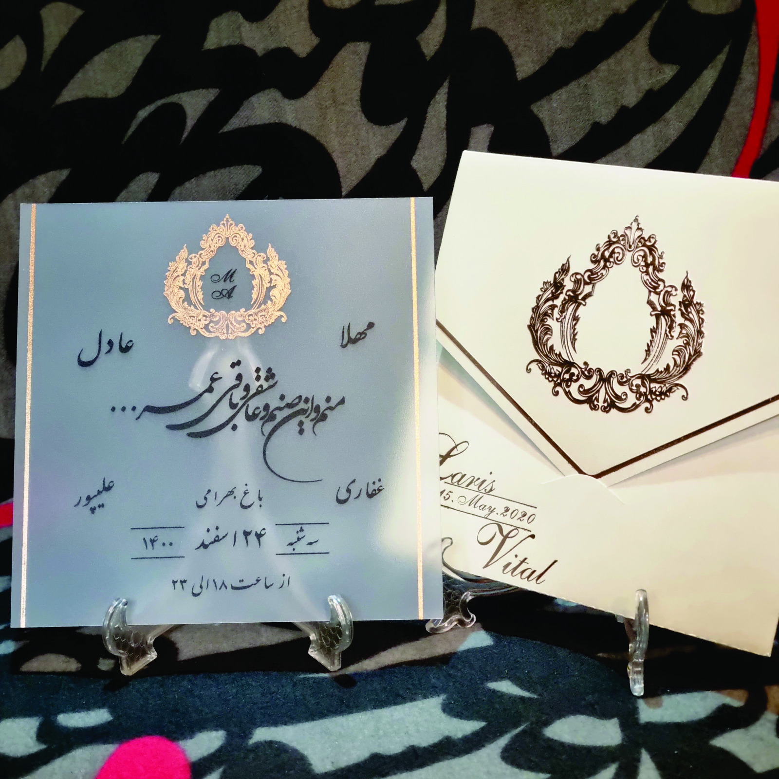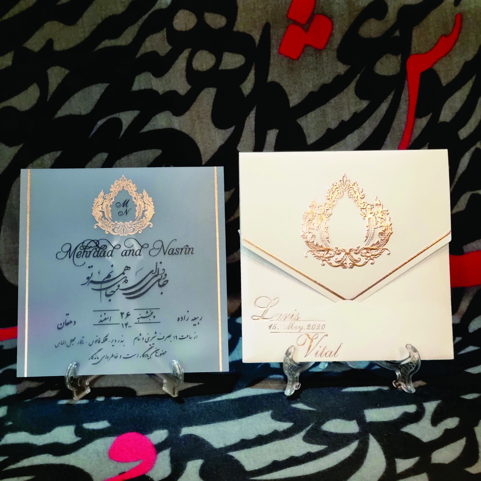 جنس این کارت عروسی طلق مات ضخیم است. جنس پاکت مقوای متالایز کرم خارجی می باشد. یک کارت عروسی شیک و مدرن می باشد