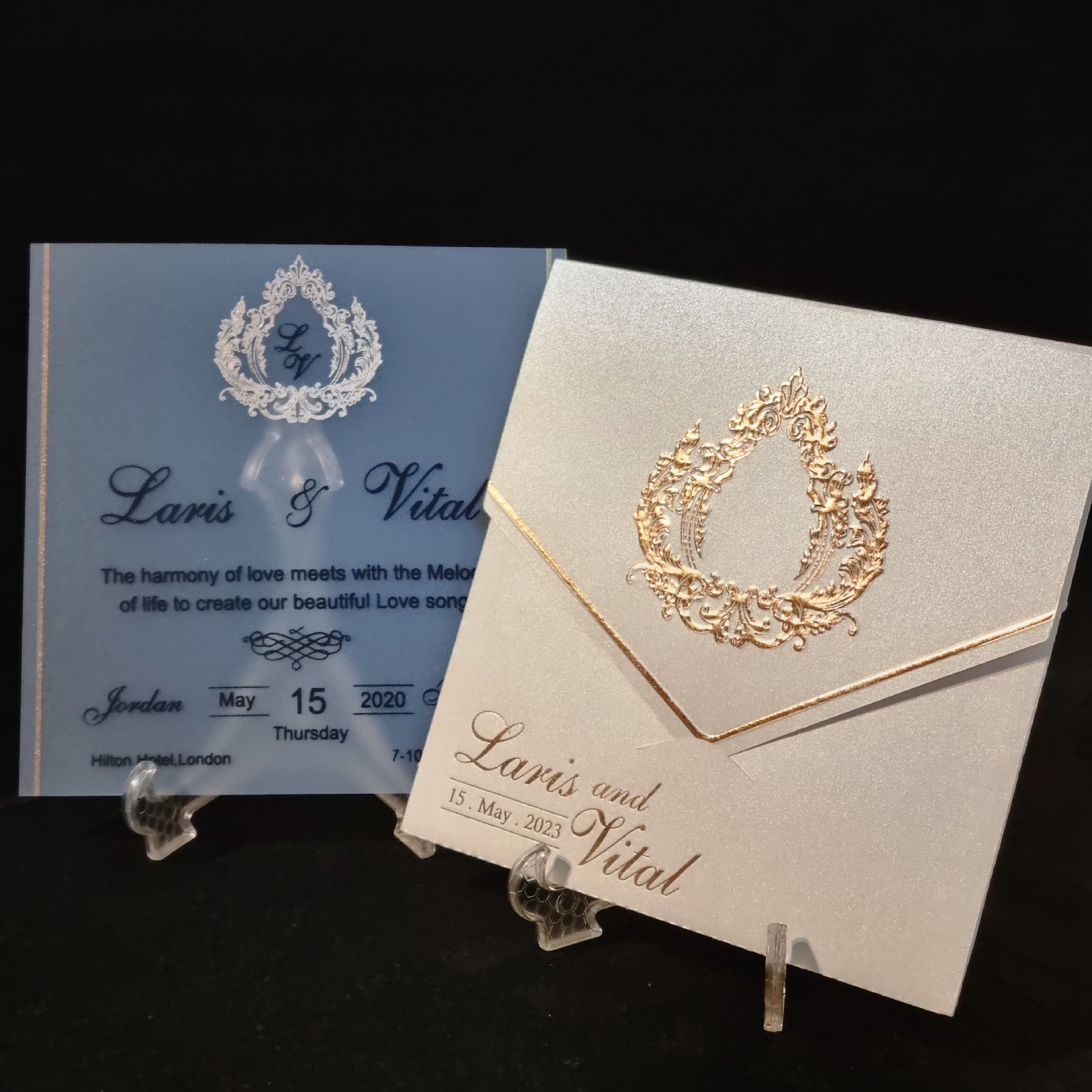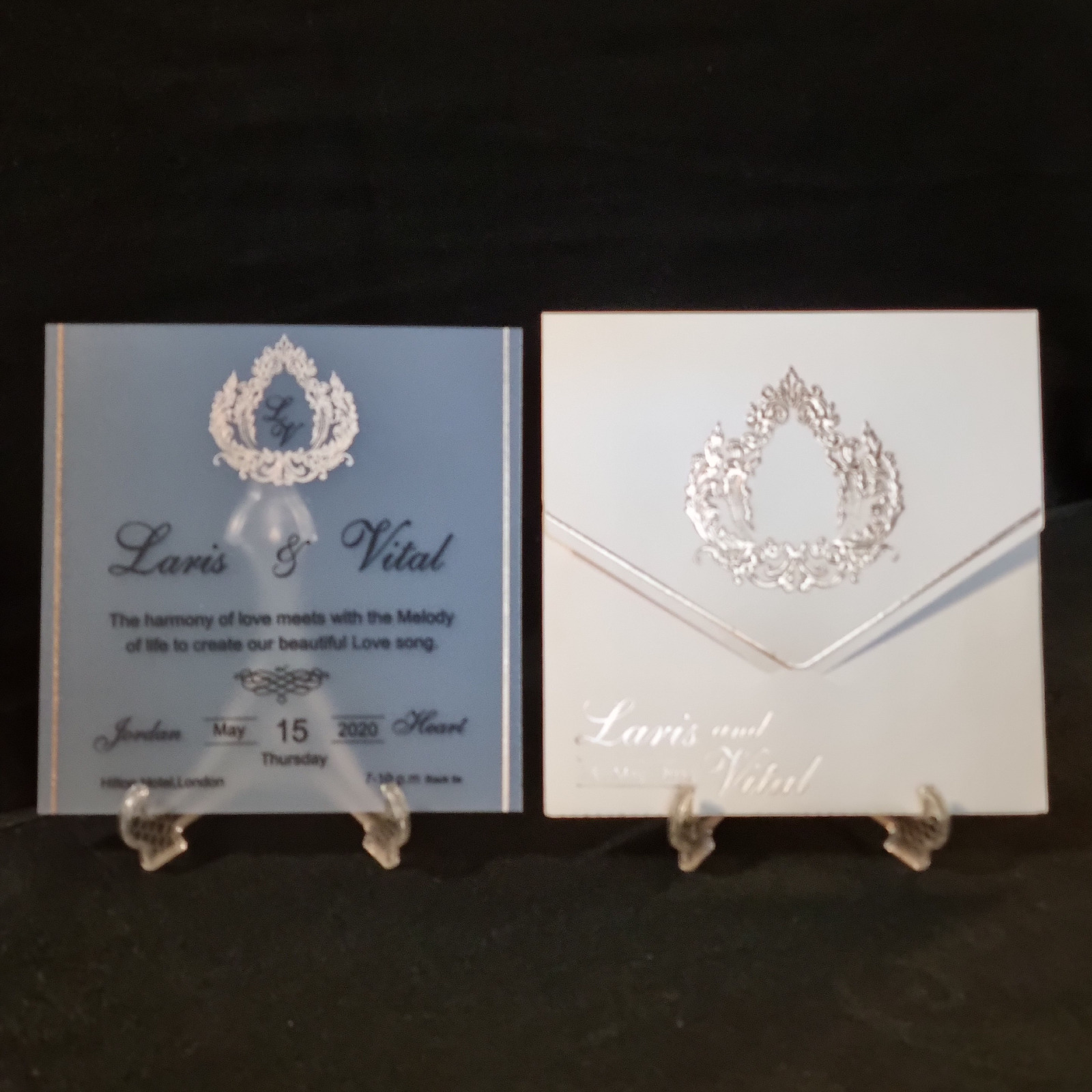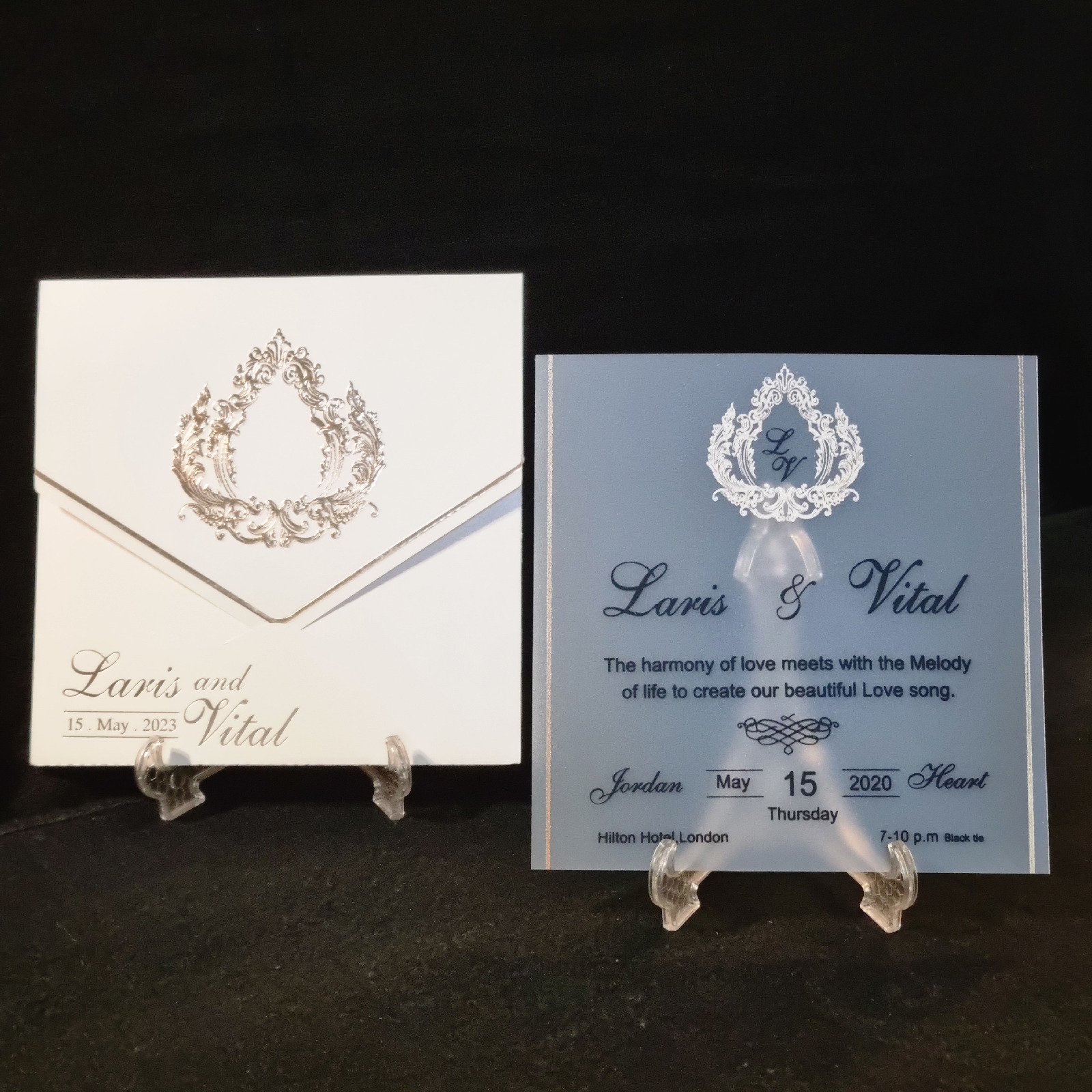 جنس این کارت عروسی طلق مات ضخیم است. جنس پاکت مقوای متالایز کرم خارجی می باشد. یک کارت عروسی شیک و مدرن می باشد