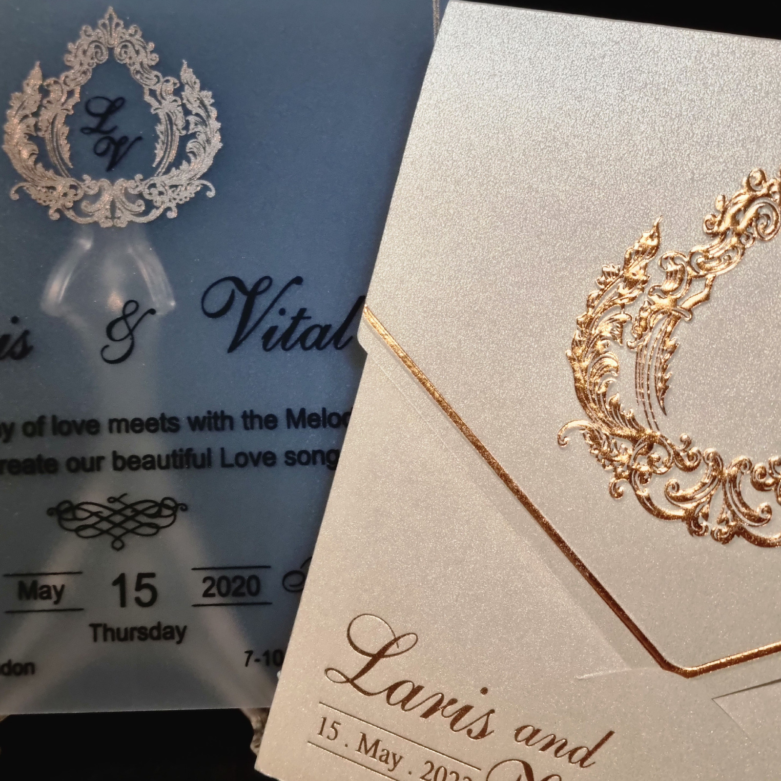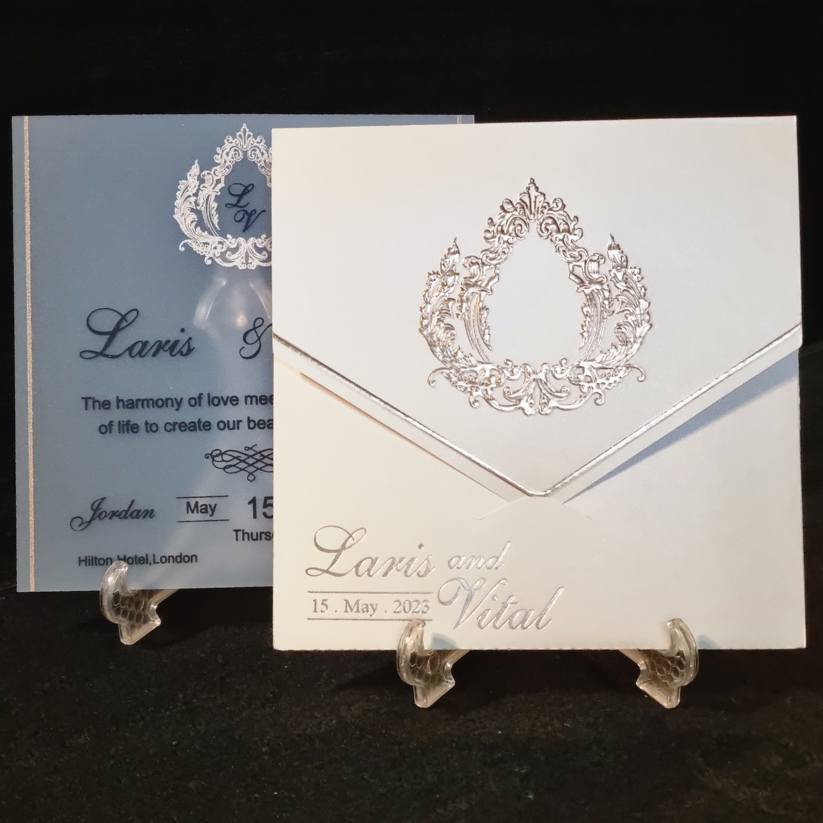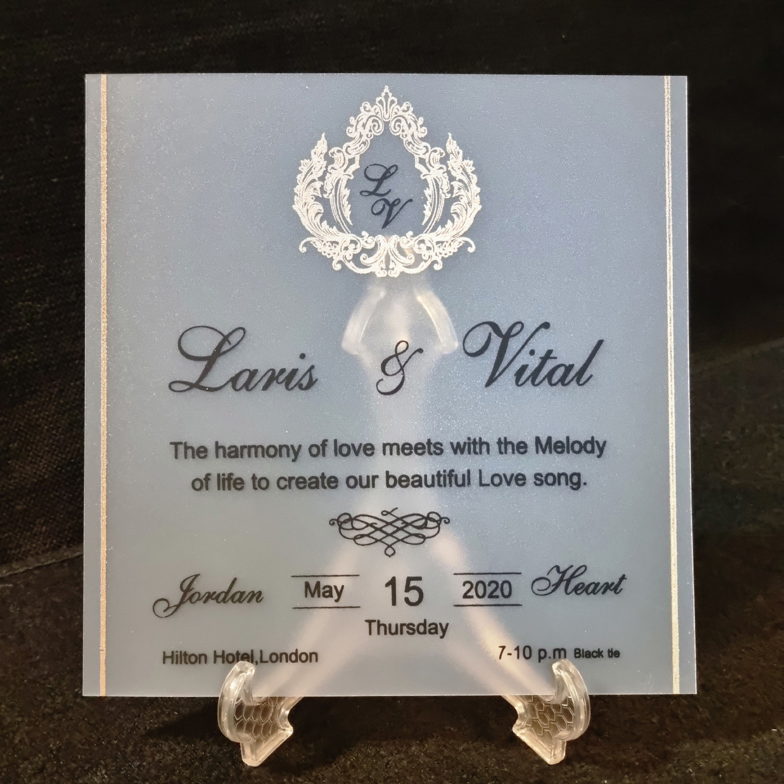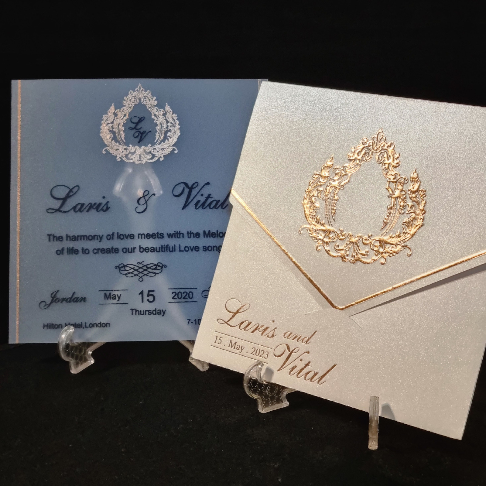 جنس این کارت عروسی طلق مات ضخیم است. جنس پاکت مقوای متالایز کرم خارجی می باشد. یک کارت عروسی شیک و مدرن می باشد