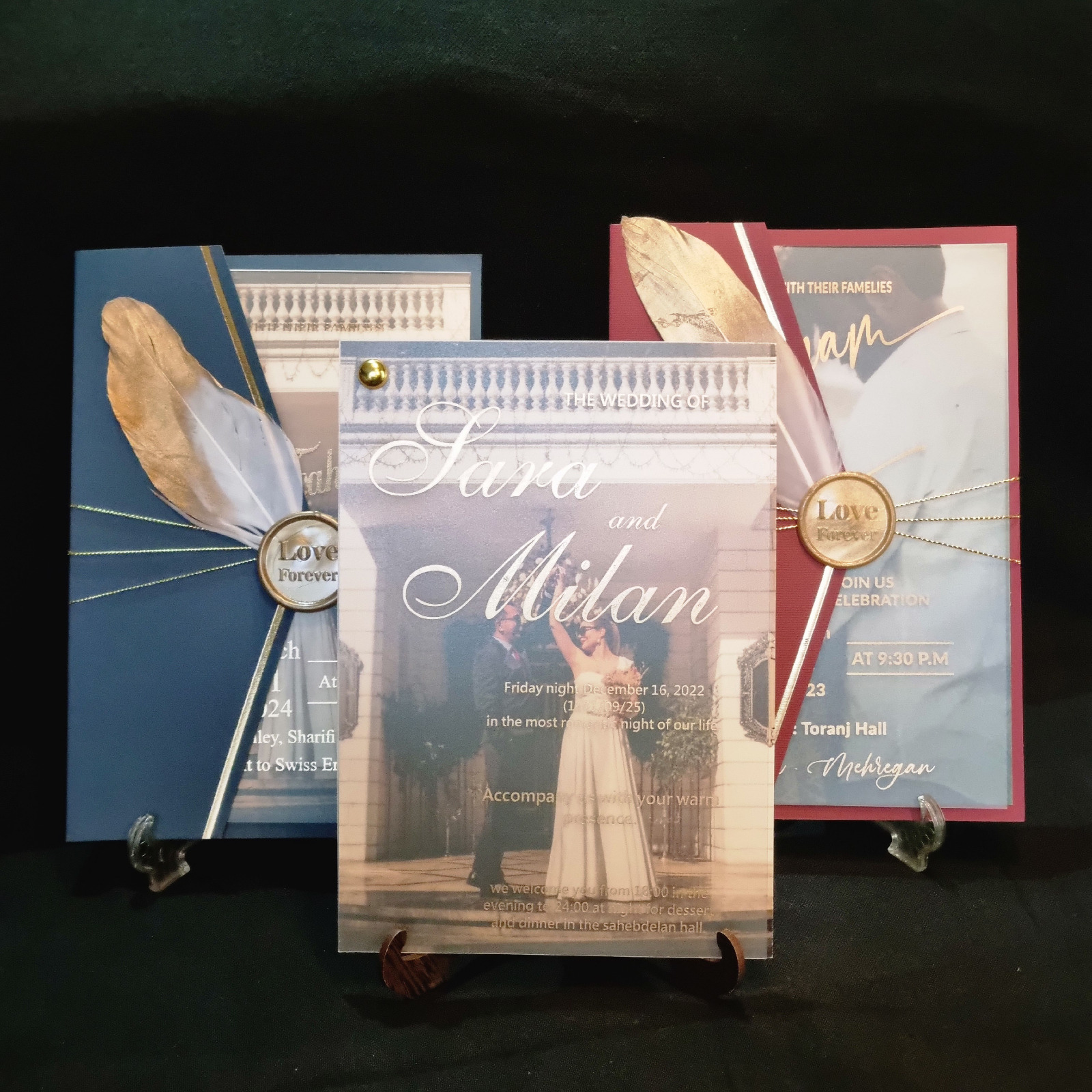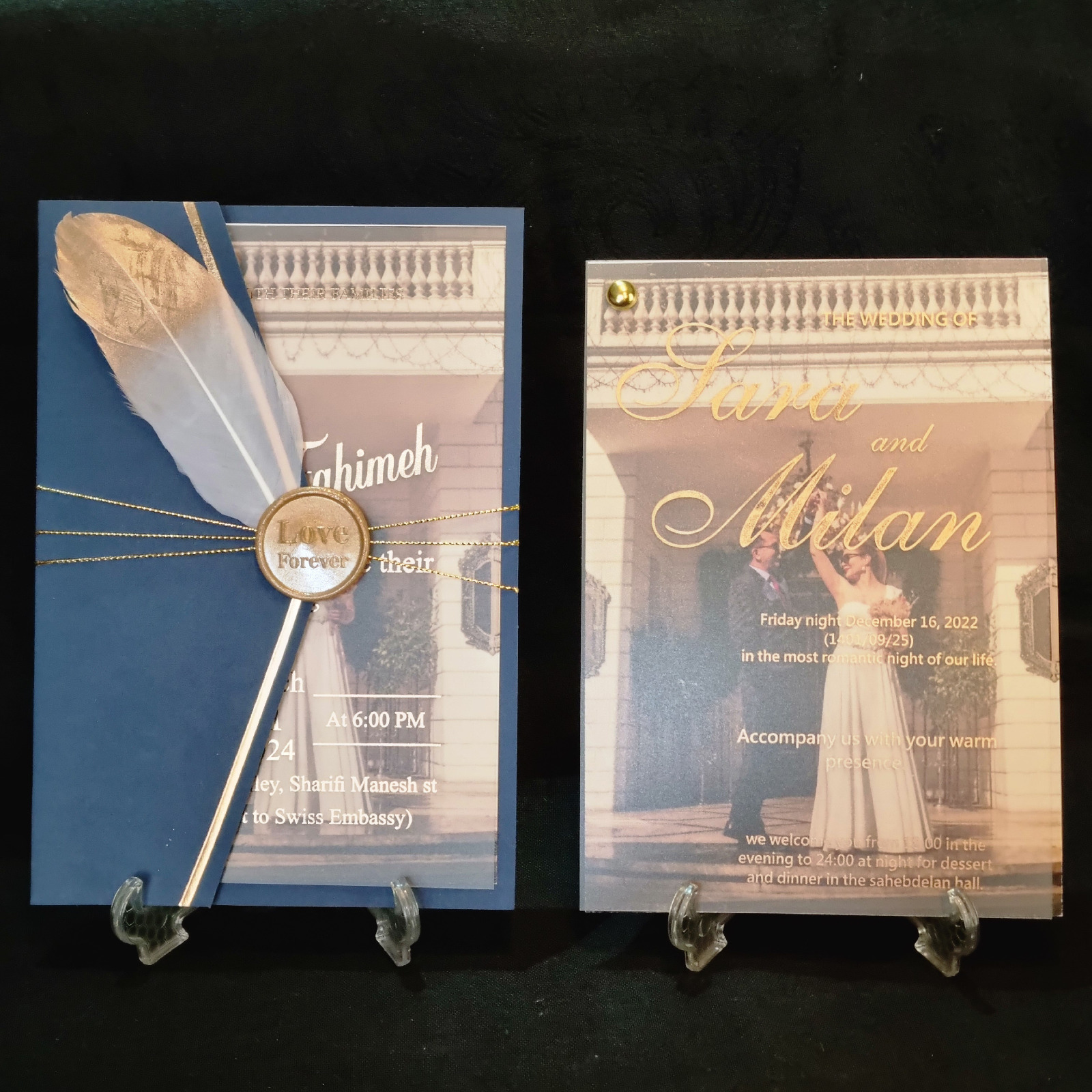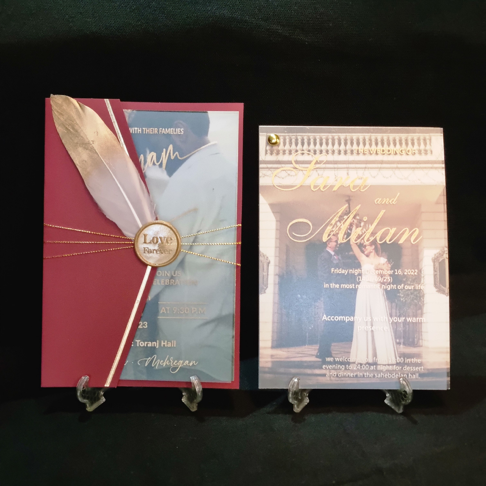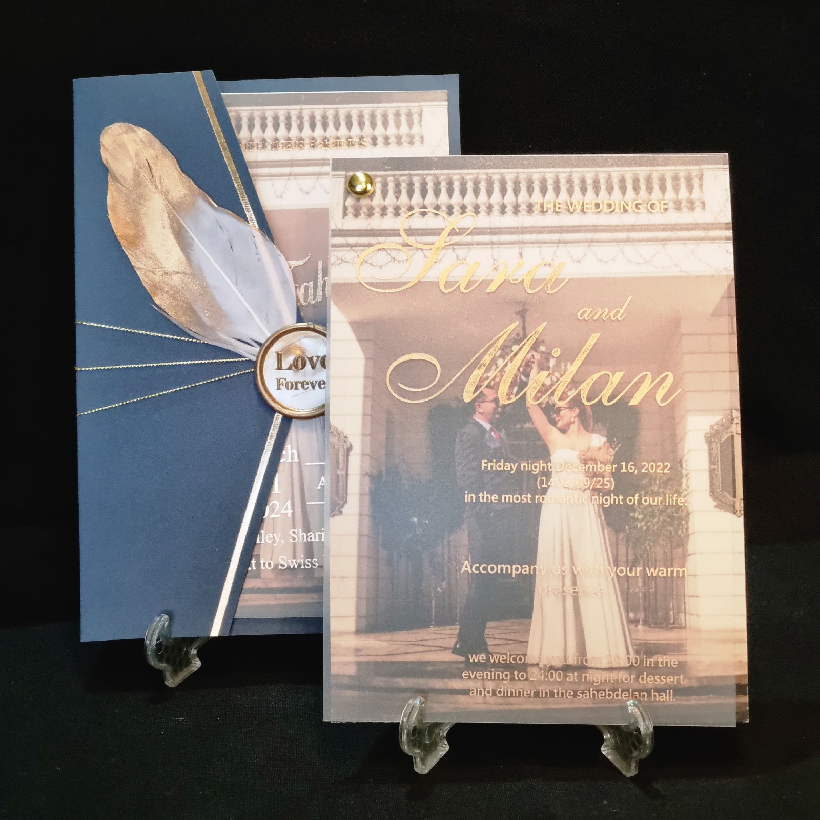 .کارت؛ طلق مات ضخیم با چاپ طلاکوب یا سیلک طلایی و زیر کارت عکس اختصاصی عروس و داماد می باشد