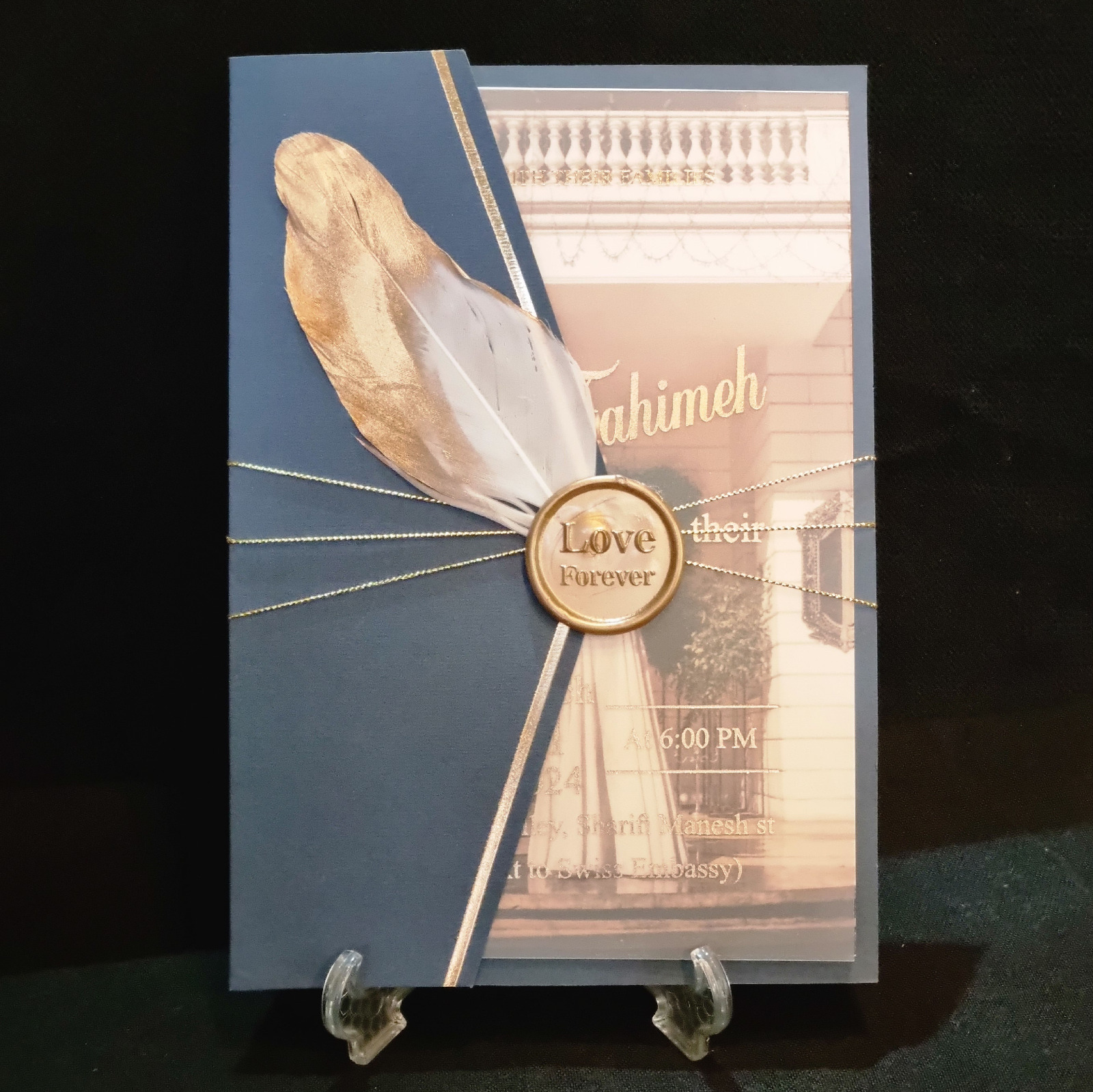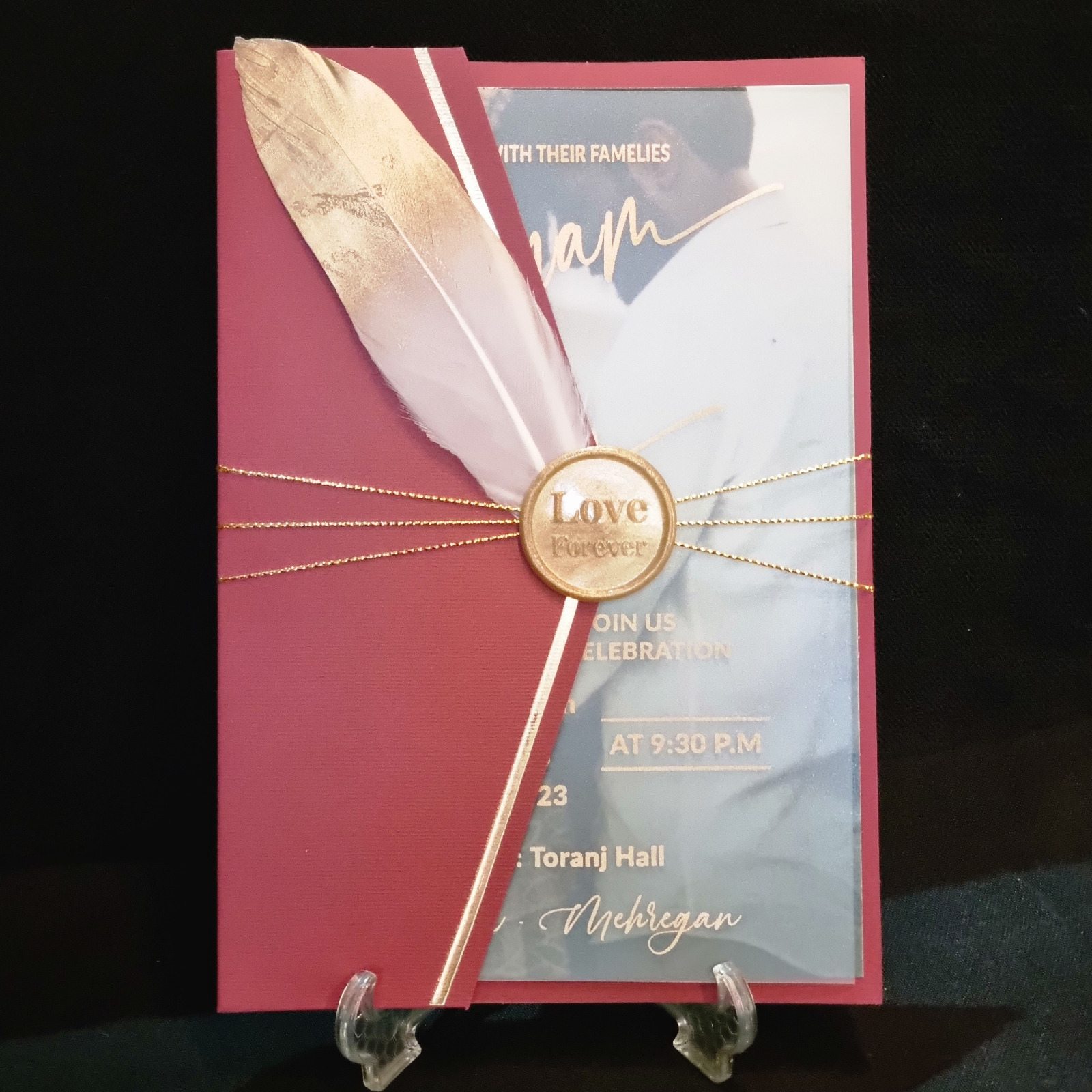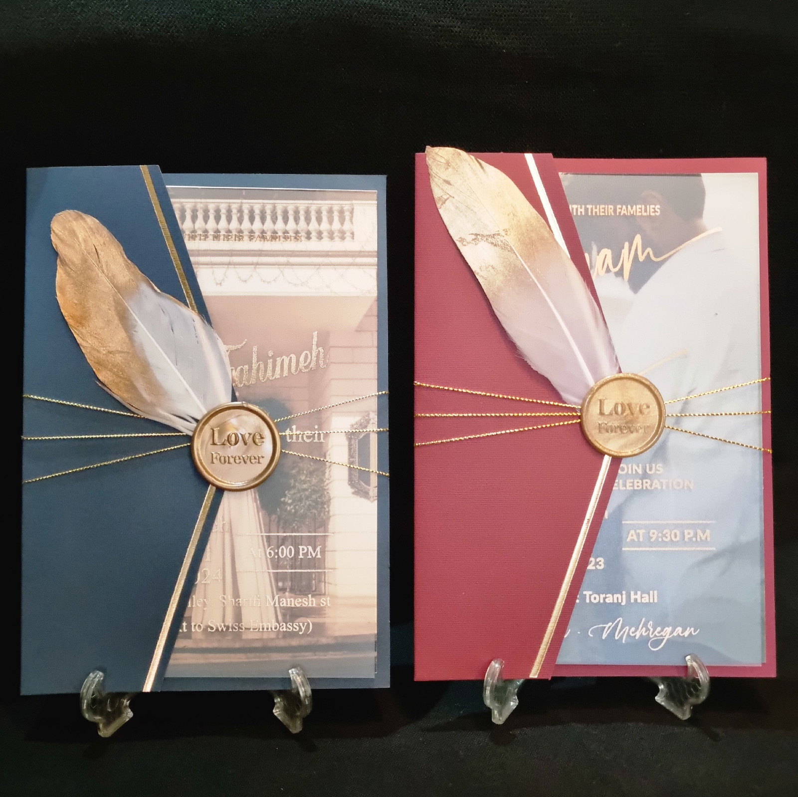 پاکت؛ مقوای سرمه ای و زرشکی ایتالیایی و کرم، همراه با مهر و موم و پر طلایی، پر دو رنگ و یا گل خشک به انتخاب و سلیقه عروس و داماد است