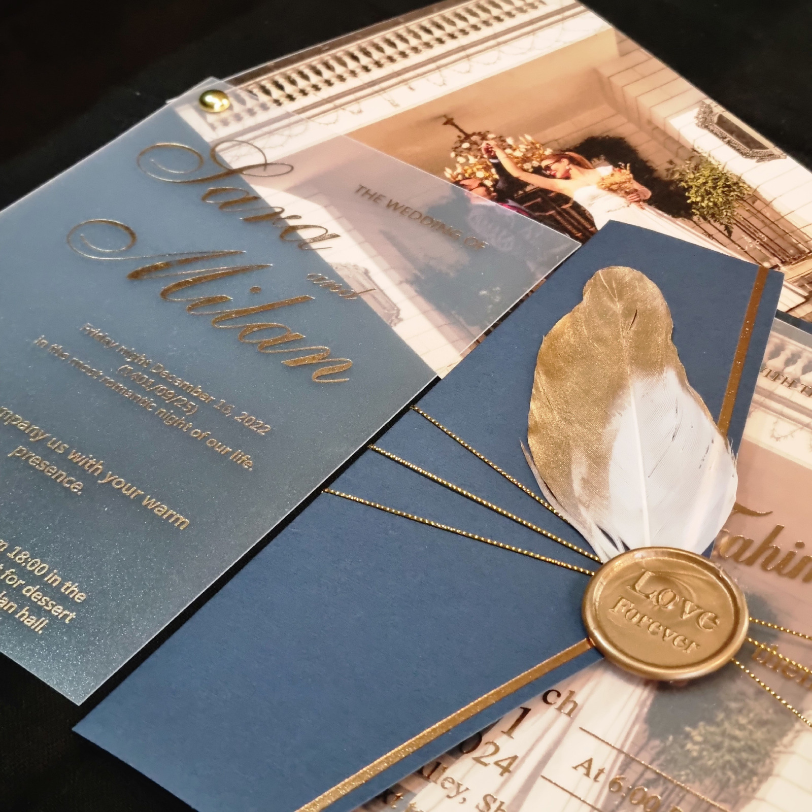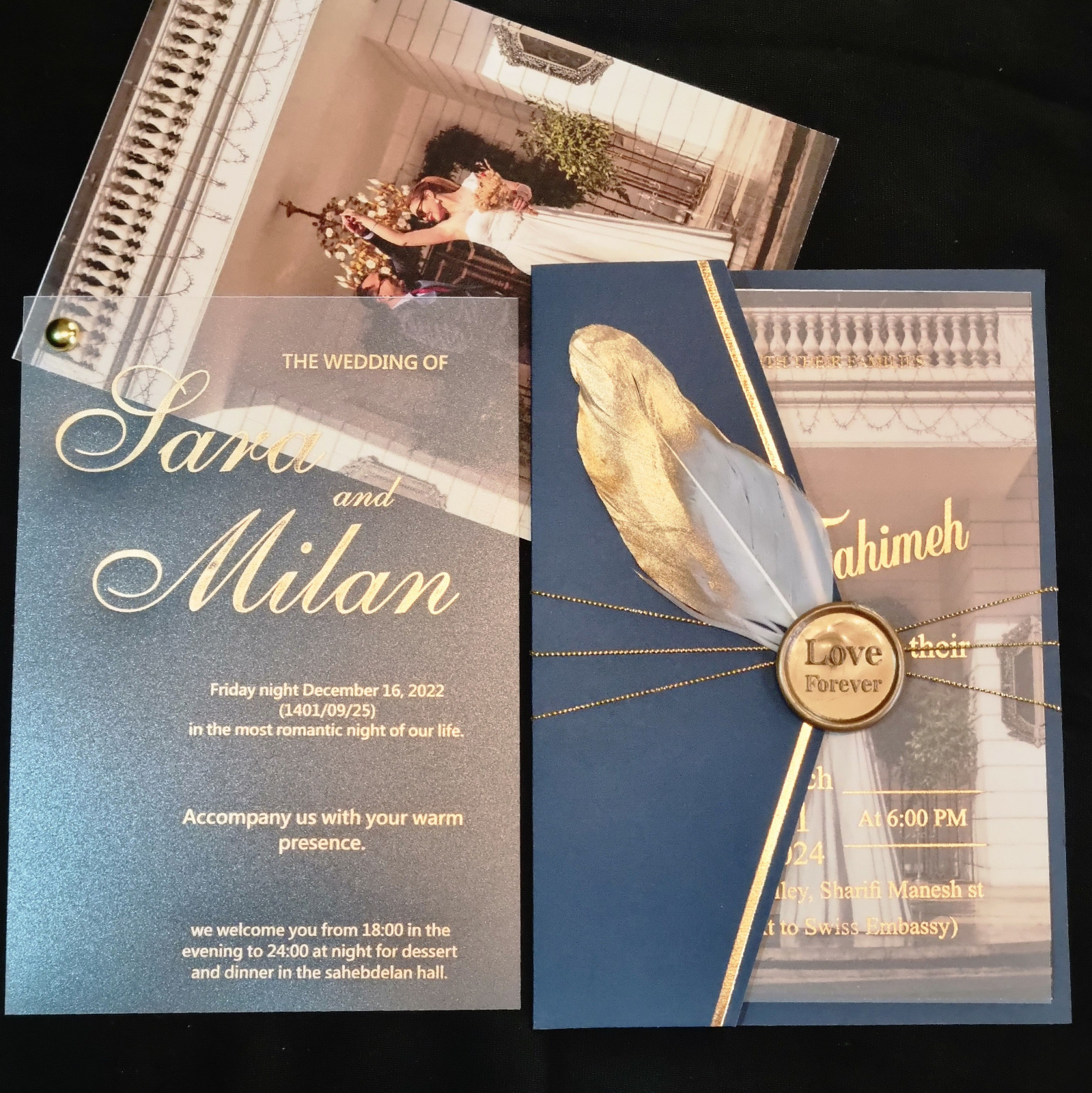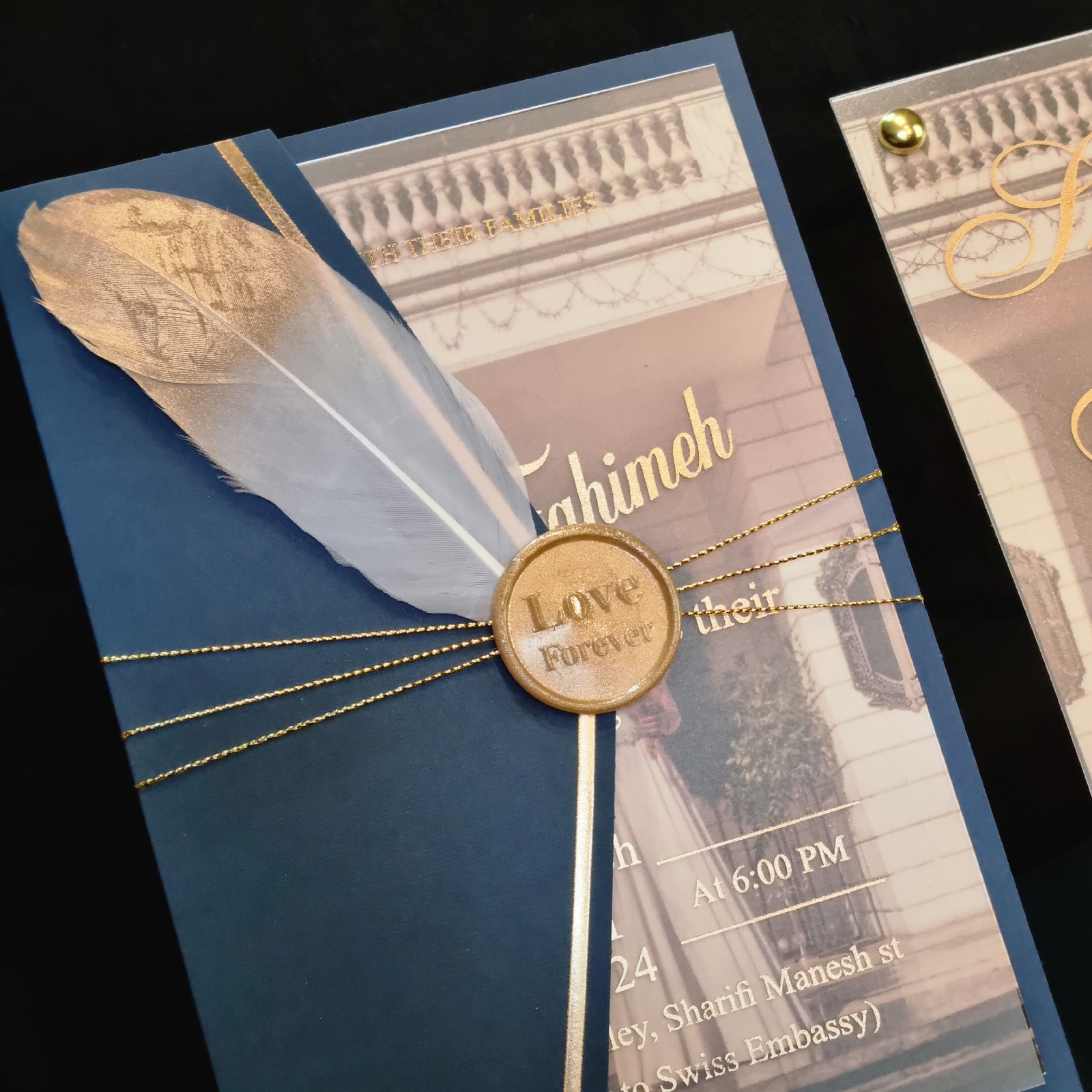 پاکت؛ مقوای سرمه ای و زرشکی ایتالیایی و کرم، همراه با مهر و موم و پر طلایی، پر دو رنگ و یا گل خشک به انتخاب و سلیقه عروس و داماد است