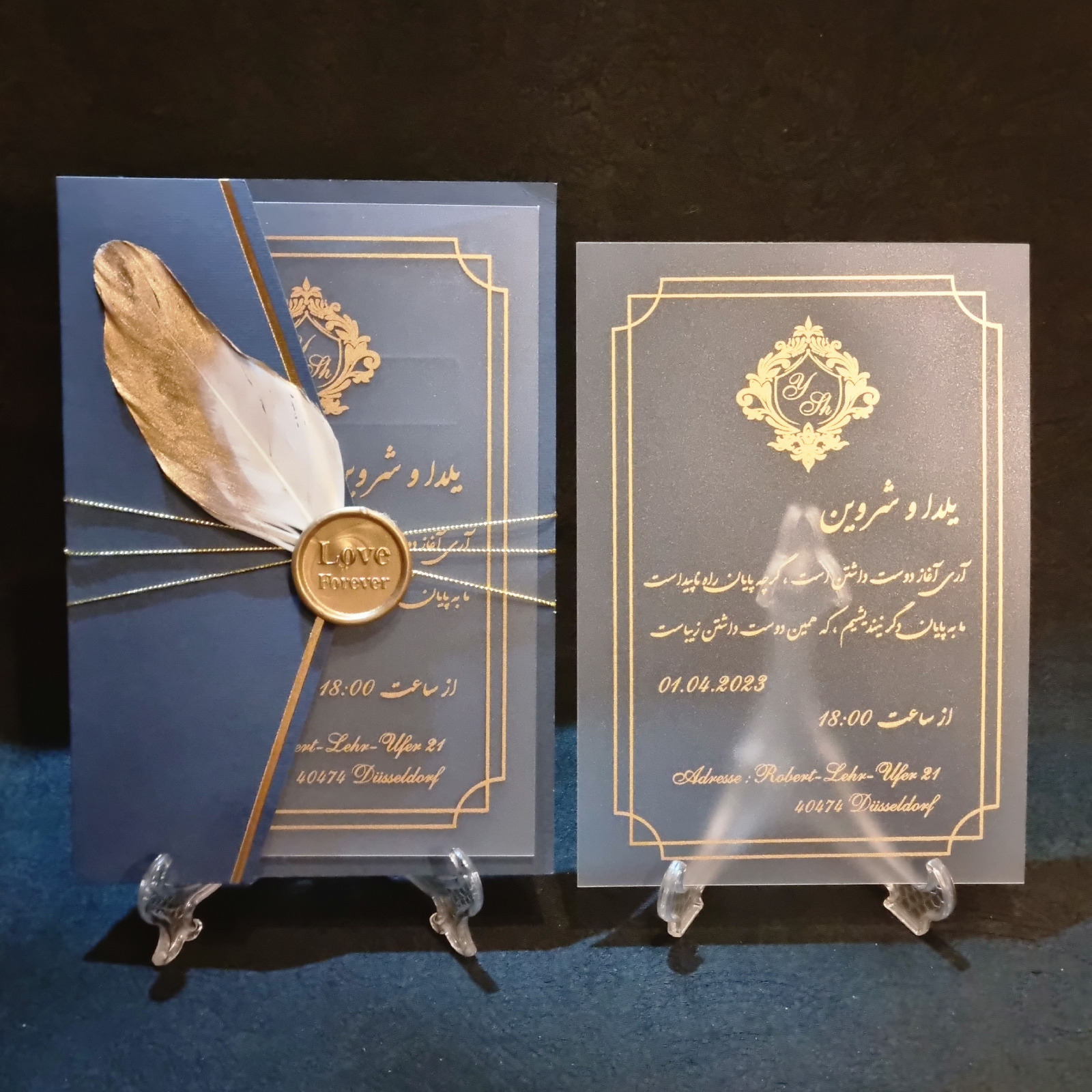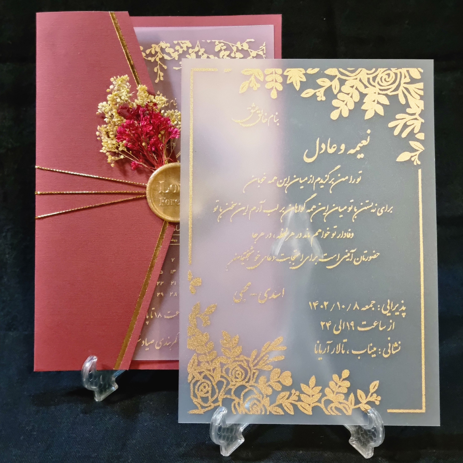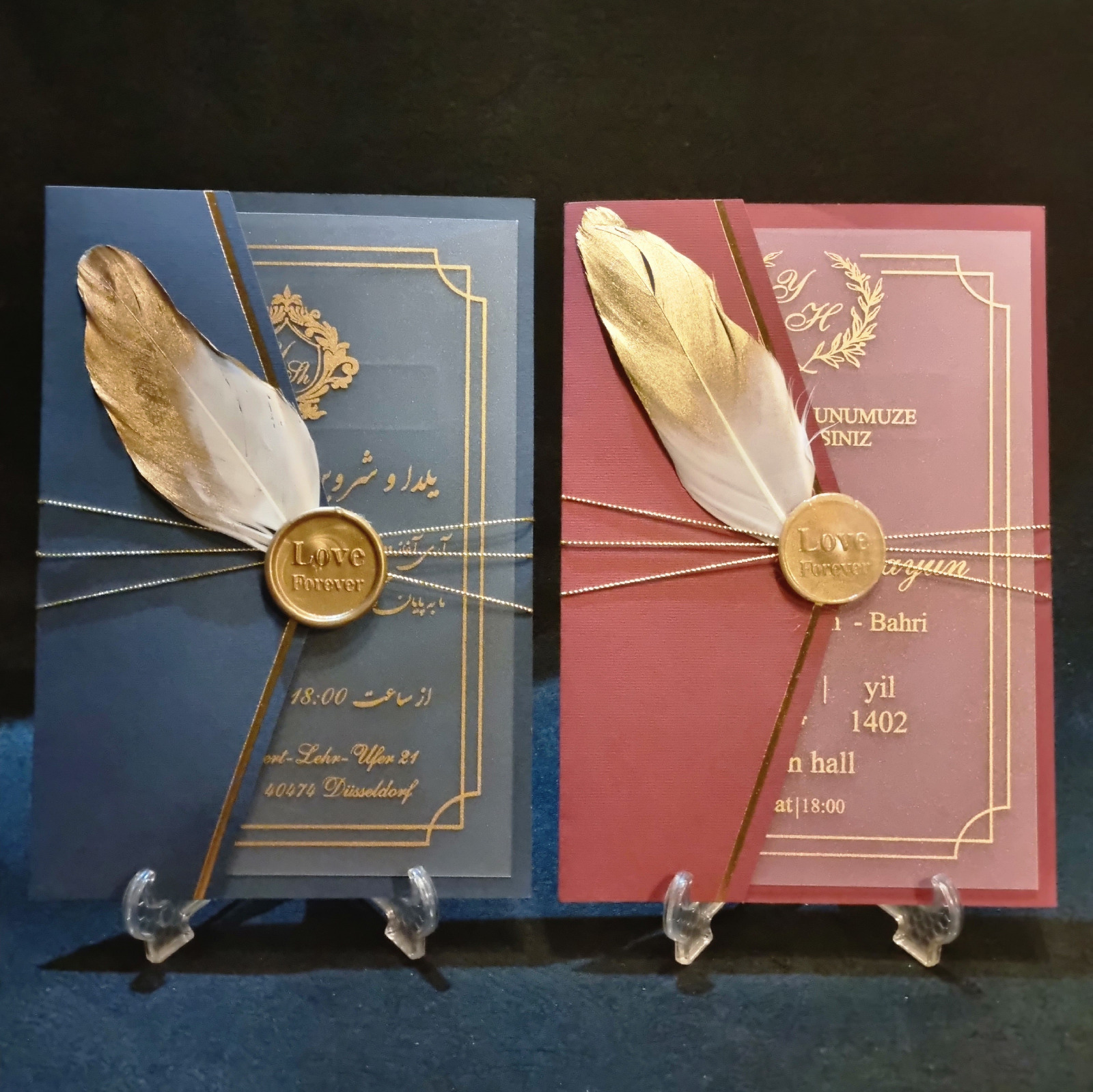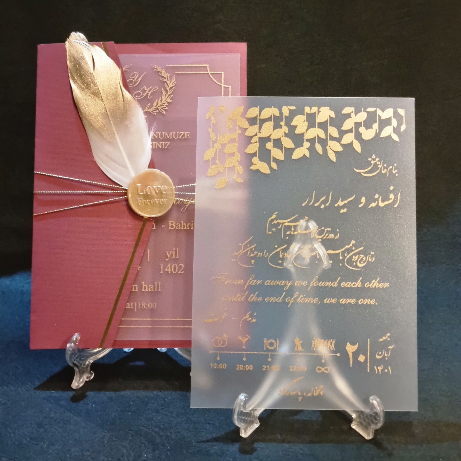جنس کارت طلق مات ضخیم. جنس پاکت مقوای سرمهای و زرشکی ایتالیایی و کرم. تنوع در چاپ طلاکوب، نقره کوب، طلایی و…. تنوع در کادر و طراحی. همراه با تزیینات مهر و موم و پر دو رنگ یک کارت بسیار شیک ، جدید و جذاب با استفاده از بهترین جنس مقوا و طلقِ موجود در بازار می باشد. امکان چاپ عکس اختصاصی عروس و داماد جهت مشاوره و اطلاع از قیمت این کارت عروسی در واتساپ یا تلگرام پیام بگذارید