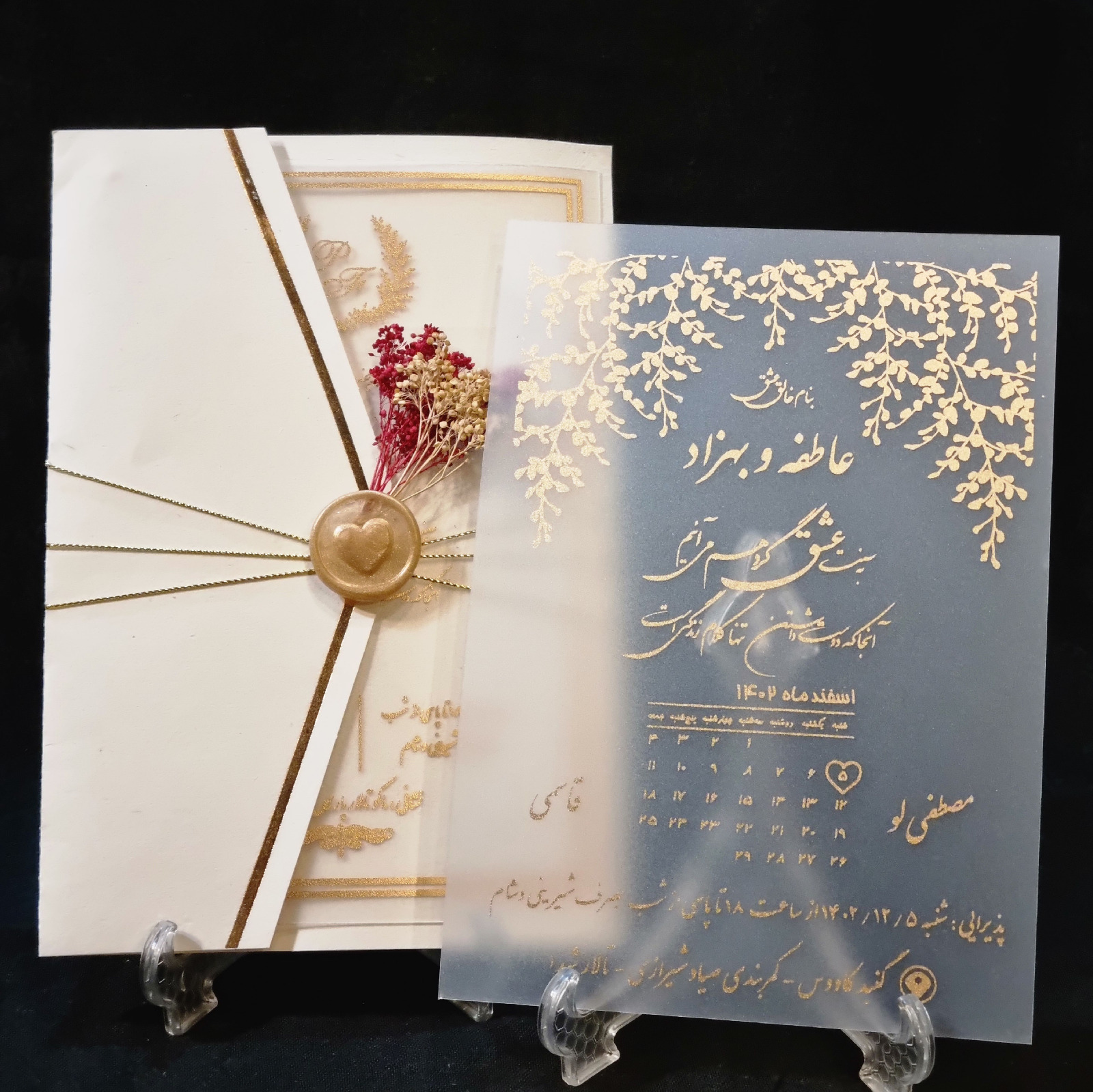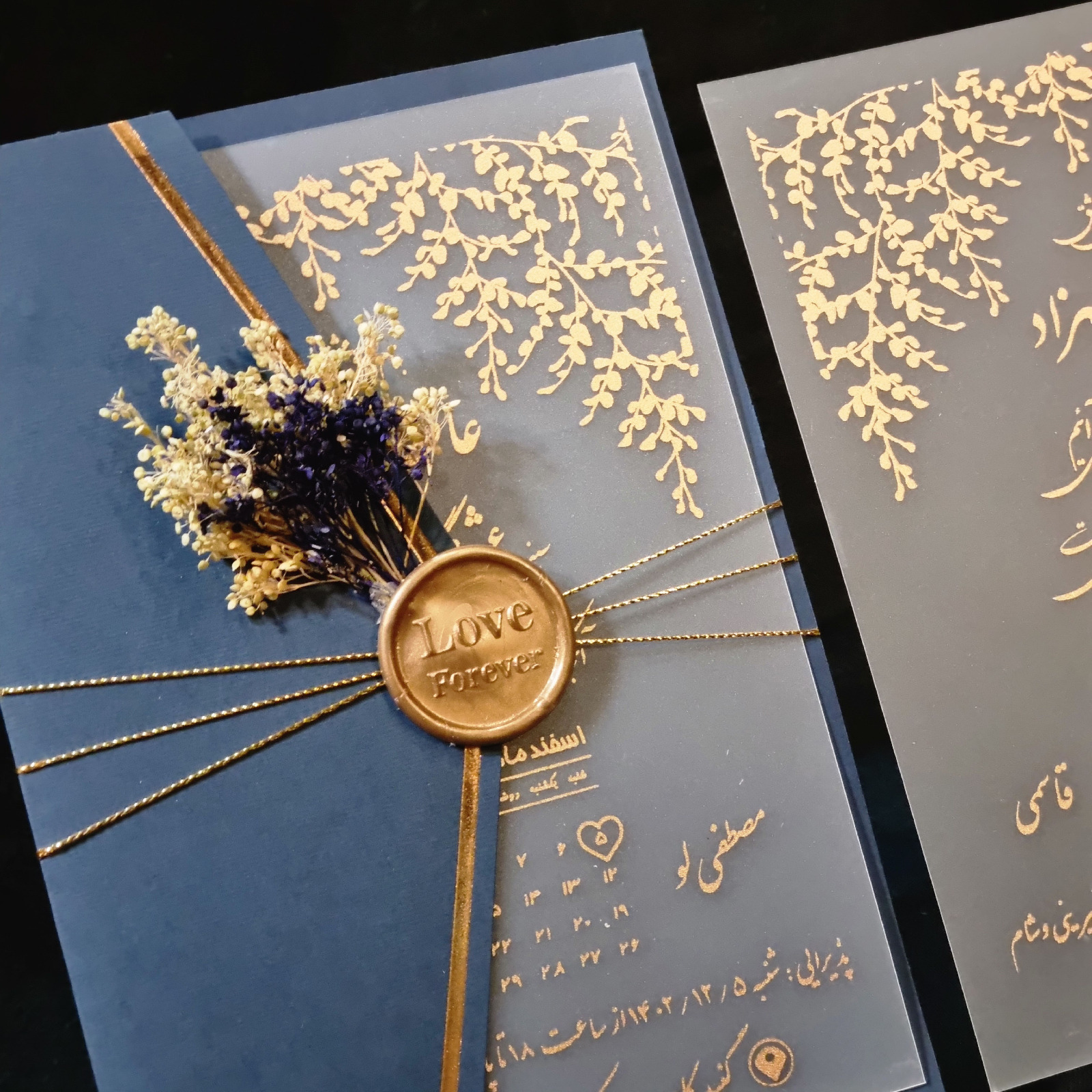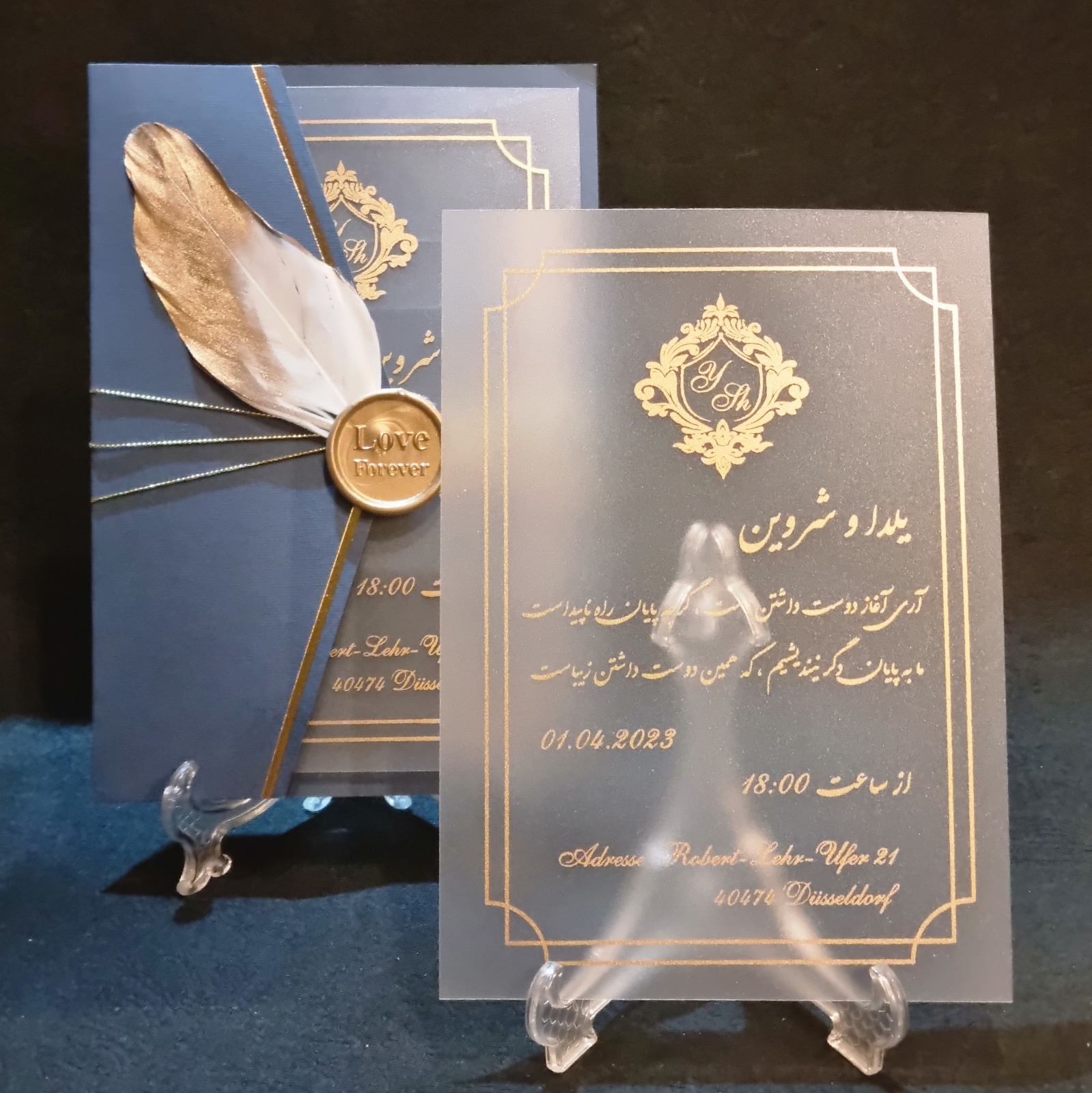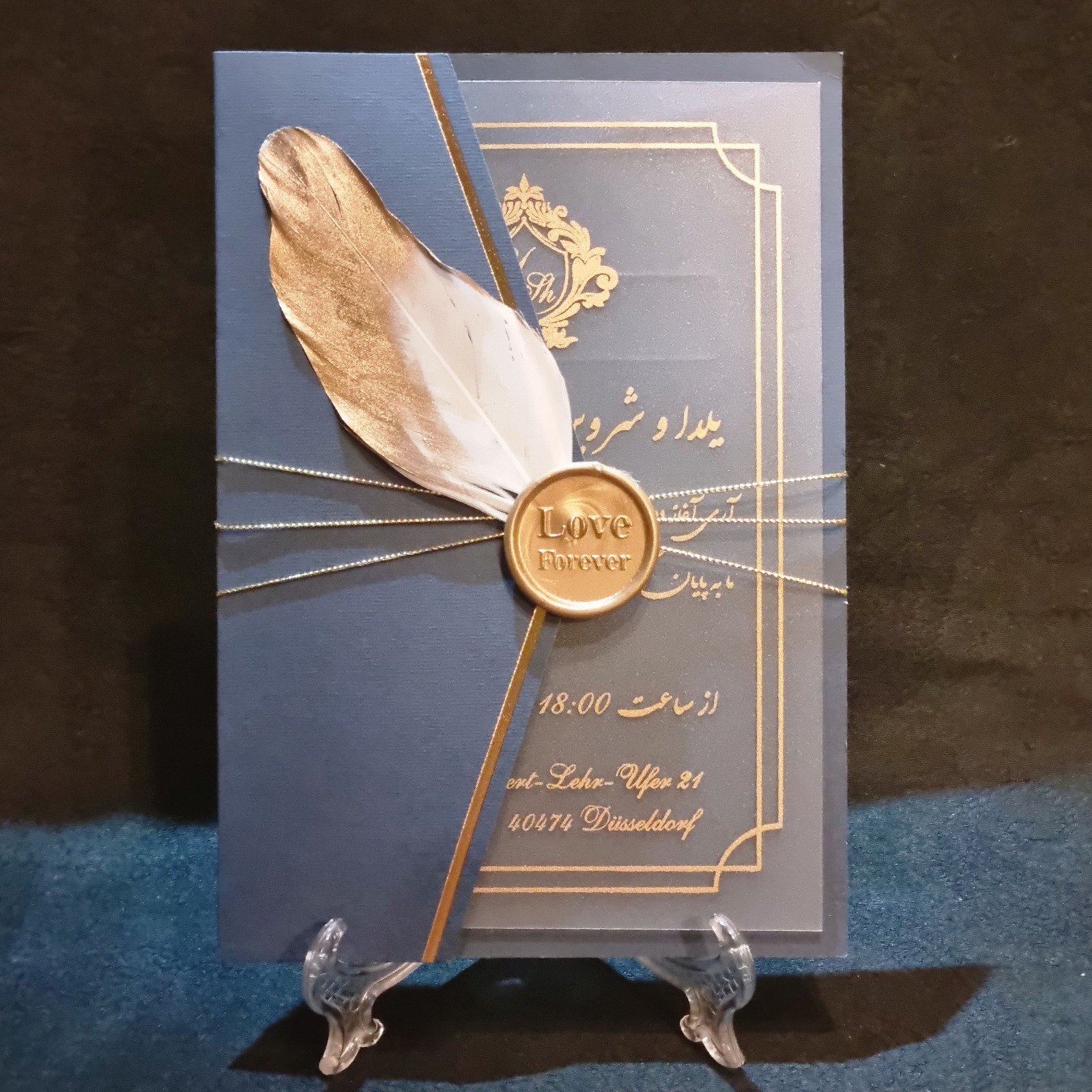 جنس کارت طلق مات ضخیم. جنس پاکت مقوای سرمهای و زرشکی ایتالیایی و کرم. تنوع در چاپ طلاکوب، نقره کوب، طلایی و…. تنوع در کادر و طراحی. همراه با تزیینات مهر و موم و پر دو رنگ یک کارت بسیار شیک ، جدید و جذاب با استفاده از بهترین جنس مقوا و طلقِ موجود در بازار می باشد. امکان چاپ عکس اختصاصی عروس و داماد جهت مشاوره و اطلاع از قیمت این کارت عروسی در واتساپ یا تلگرام پیام بگذارید
