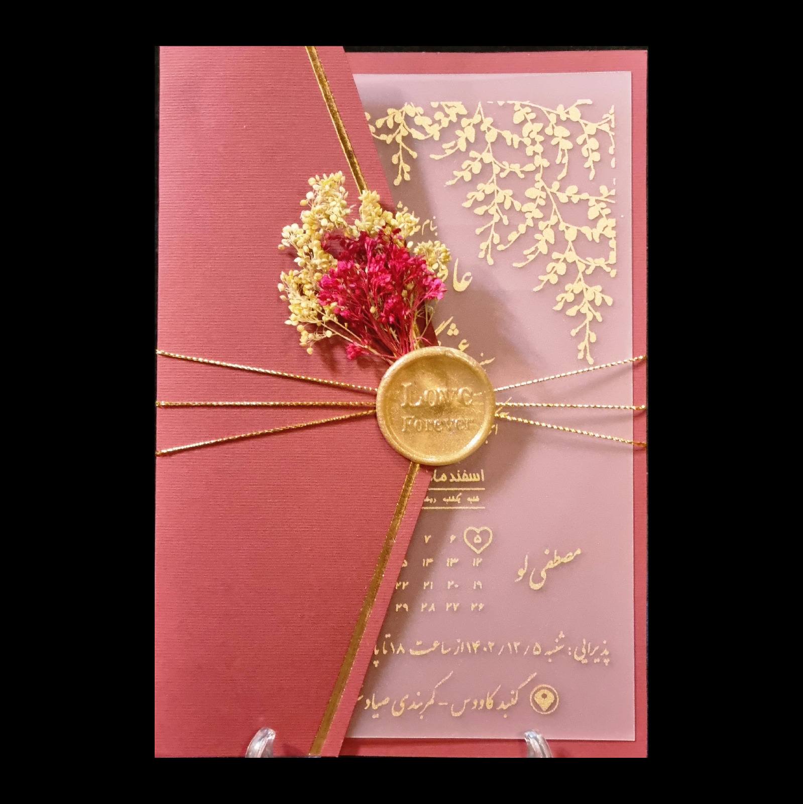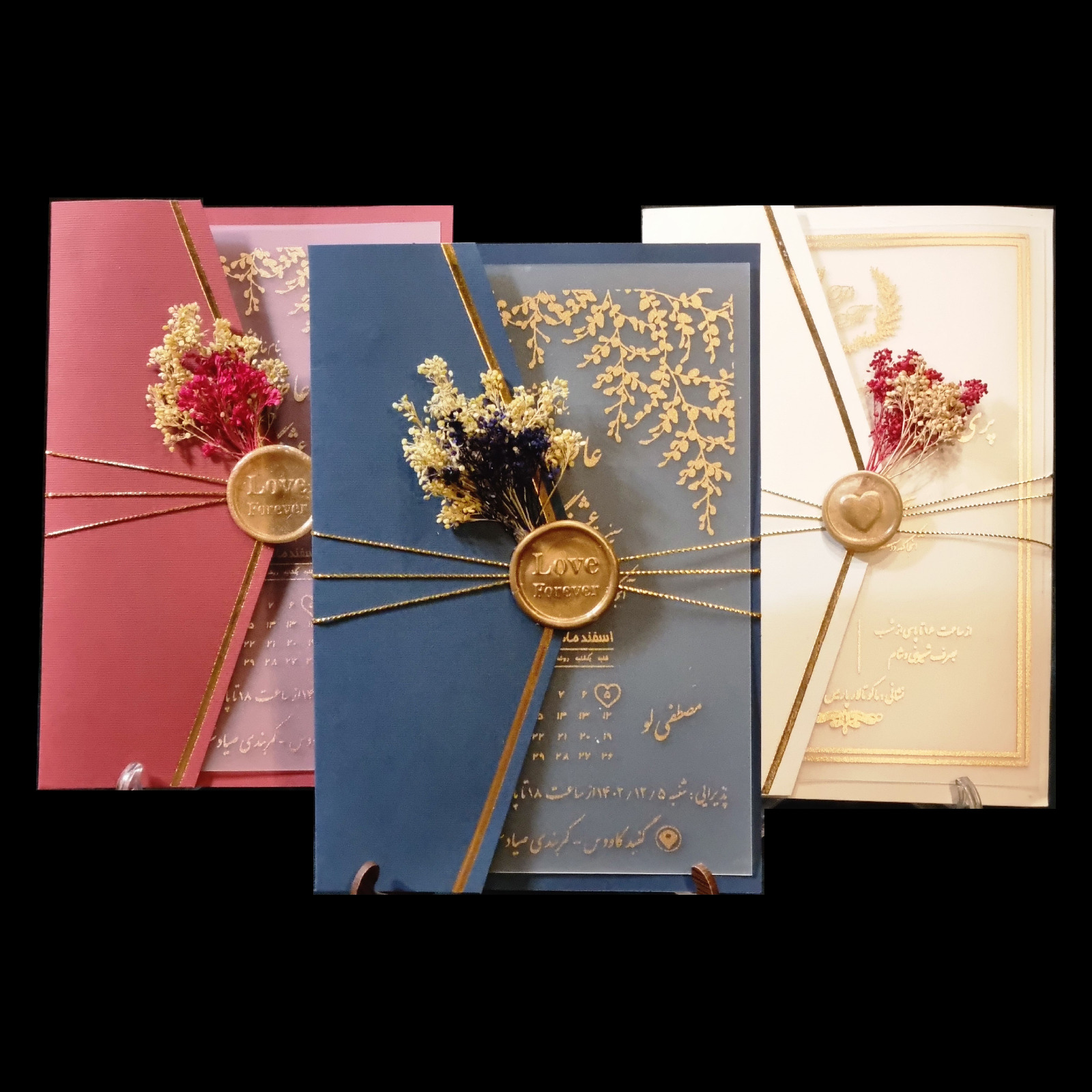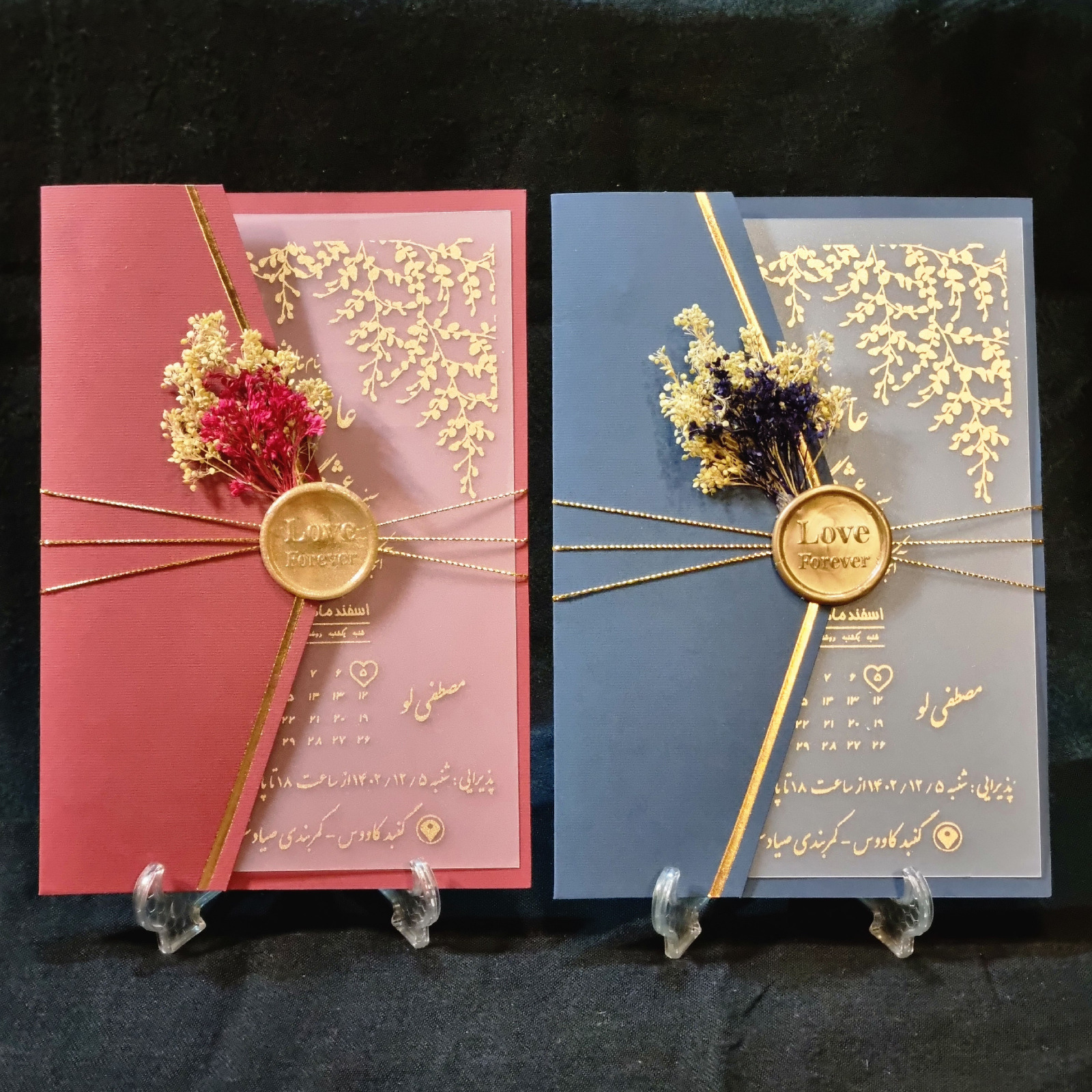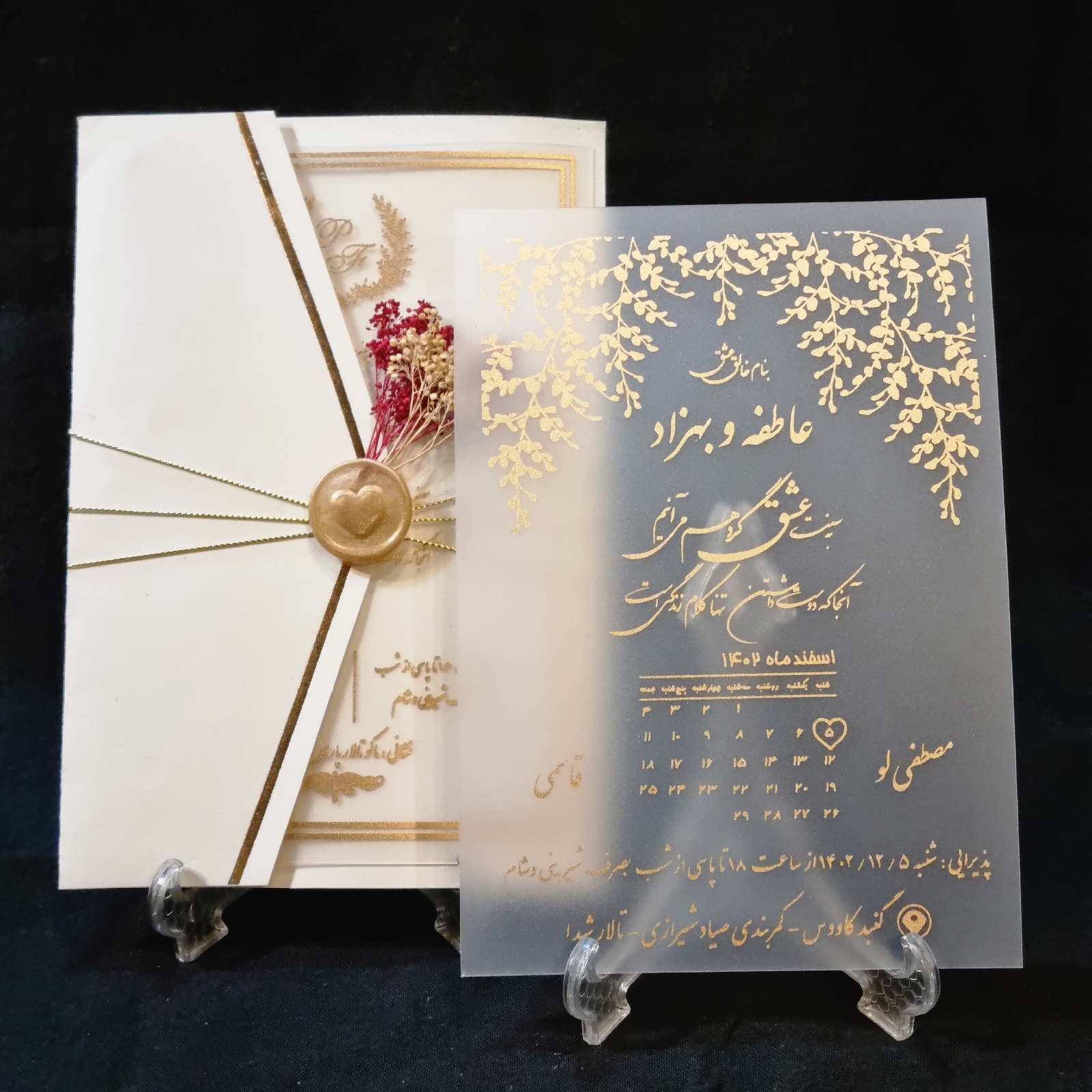 جنس کارت طلق مات ضخیم. جنس پاکت مقوای سرمهای و زرشکی ایتالیایی و کرم. تنوع در چاپ طلاکوب، نقره کوب، طلایی و…. تنوع در کادر و طراحی. همراه با تزیینات مهر و موم و پر دو رنگ یک کارت بسیار شیک ، جدید و جذاب با استفاده از بهترین جنس مقوا و طلقِ موجود در بازار می باشد. امکان چاپ عکس اختصاصی عروس و داماد جهت مشاوره و اطلاع از قیمت این کارت عروسی در واتساپ یا تلگرام پیام بگذارید